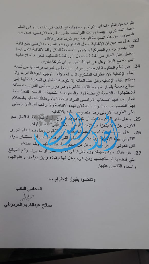 24.هل تعلم الحكومة أن صدور قرار عن مجلس النواب برفضها من شأنه إلغاء الإتفاقية لأن الطرف المشتري لا يد له بالإلغاء لوجود القوة القاهرة، ولا يحتاج إنهاء الإتفاقية وفق هذه الحالة إلا لتوجيه المشتري إشعارا كتابيا إلى البائع يعلمهُ بتوفر شروط القوة القاهرة وهو قرار مجلس النواب، إضافة للاحتجاجات الشعبية الرافضة لها، والمعارضة الشعبية الرافضة لتنفيذ خط الغاز بما فيها اصحاب الاراضي المراد استملاكها، وهناك قضايا بالمحاكم بهذا الخصوص مما يرتب البطلان لهذه الاتفاقية ولا يرتب أي التزام مالي على الطرف الأردني وهذا منصوص عليه بالاتفاقية.
