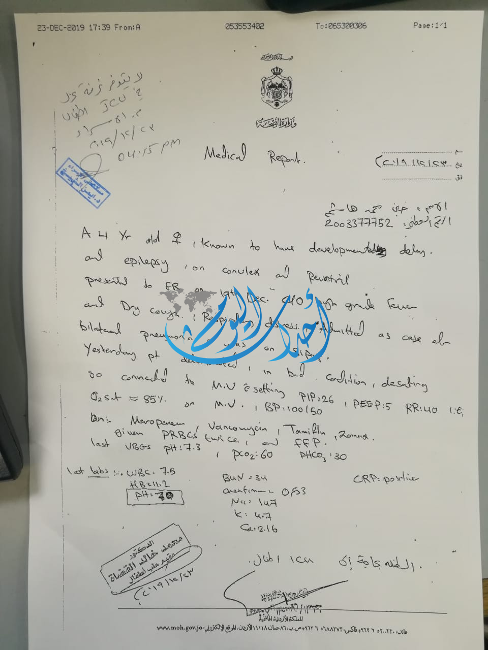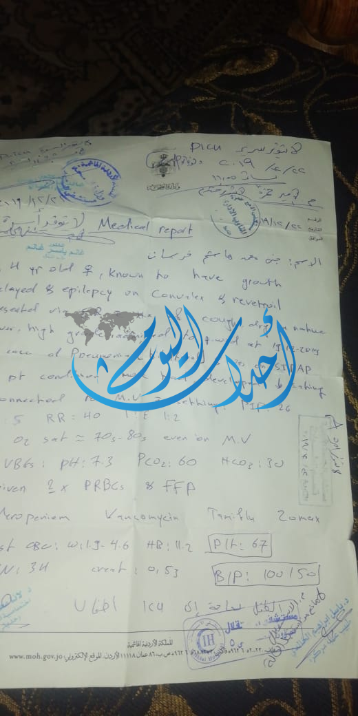 أحداث اليوم - أحمد الملكاوي - توفيت الطفلة جنى هاشم التي تبلغ من العمر 4 سنوات إثر إصابتها بضيق تنفس نتيجة التهاب رئوي حادّ في مستشفى السلط بعد رفض عدة مستشفيات علاجها بحجة عدم توفر أسرّة.