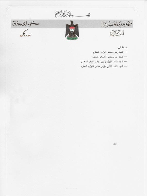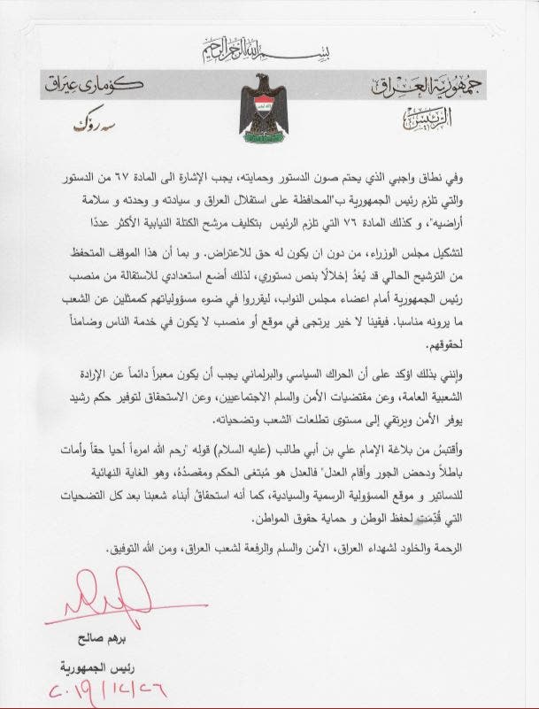 وأضاف أن "منصب رئيس الجمهورية يجب أن يستجيب لإرادة الشعب"، لذا "أضع استعدادي للاستقالة أمام البرلمان العراقي".
