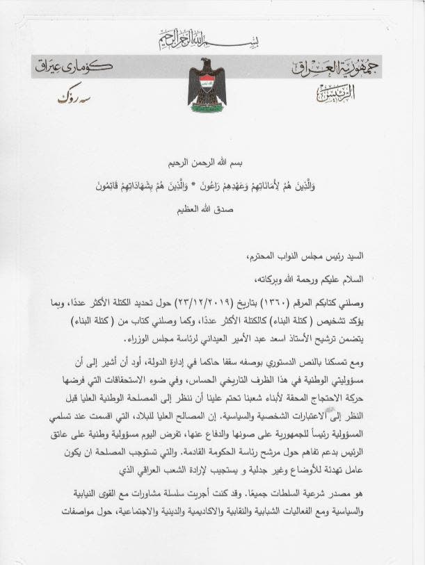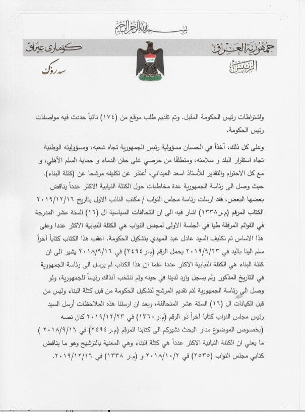 وقال إنه قد وصلته "عدة مخاطبات حول الكتلة الأكبر تناقض بعضها بعضاً"، مضيفاً: "أعتذر عن تكليف مرشح عن كتلة البناء".