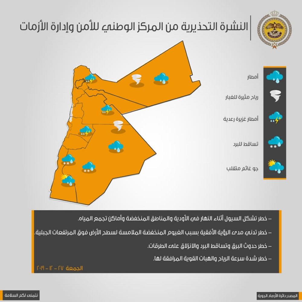 ونشر المركز الوطني للأمن وإدارة الأزمات، عبر صفحته الرسمية على موقع "فيسبوك" خارطة مخاطر الحالة الجوية لليوم الجمعة.