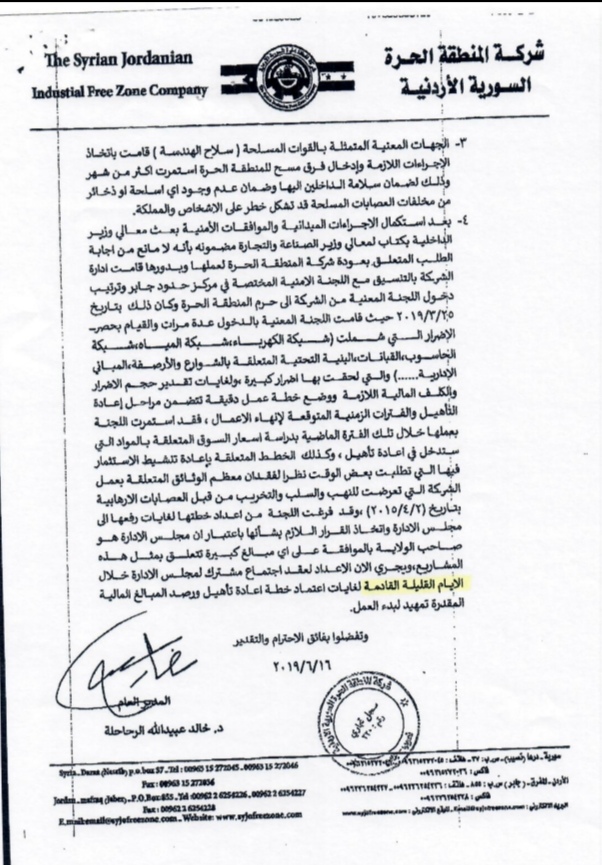 وكان مدير المنطقة الحرة السورية الأردنية خالد الرحاحلة، أعلن قبل عدة أشهر نية إدارة المنطقة المباشرة بإعادة فتح وتأهيل المنطقة بعد موافقة وزارة الداخلية والجهات المعنية، الا أن ذلك لم يحدث رغم تكليف من إدارة شركة المنطقة الحرة الأردنية السورية، والجمعية العمومية المكونة من وزير الصناعة والتجارة الأردني ووزير الاقتصاد والتجارة السوري، باستلام المنطقة لبدء إعادة تأهيلها.