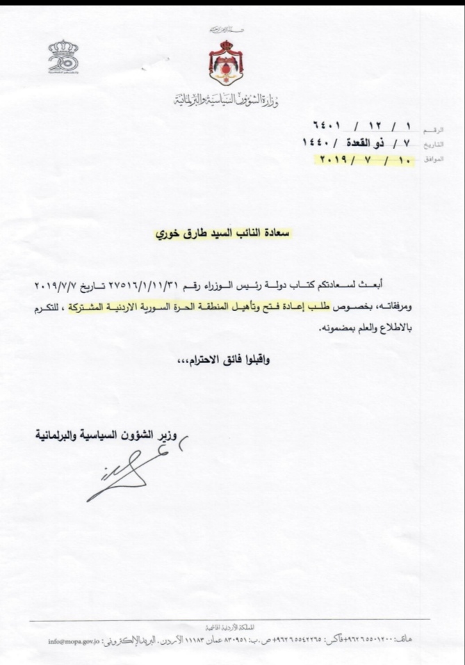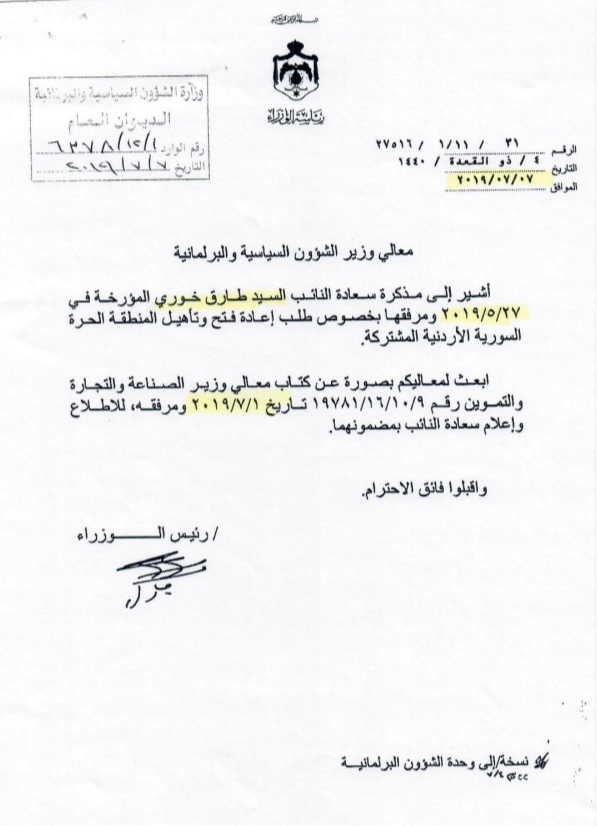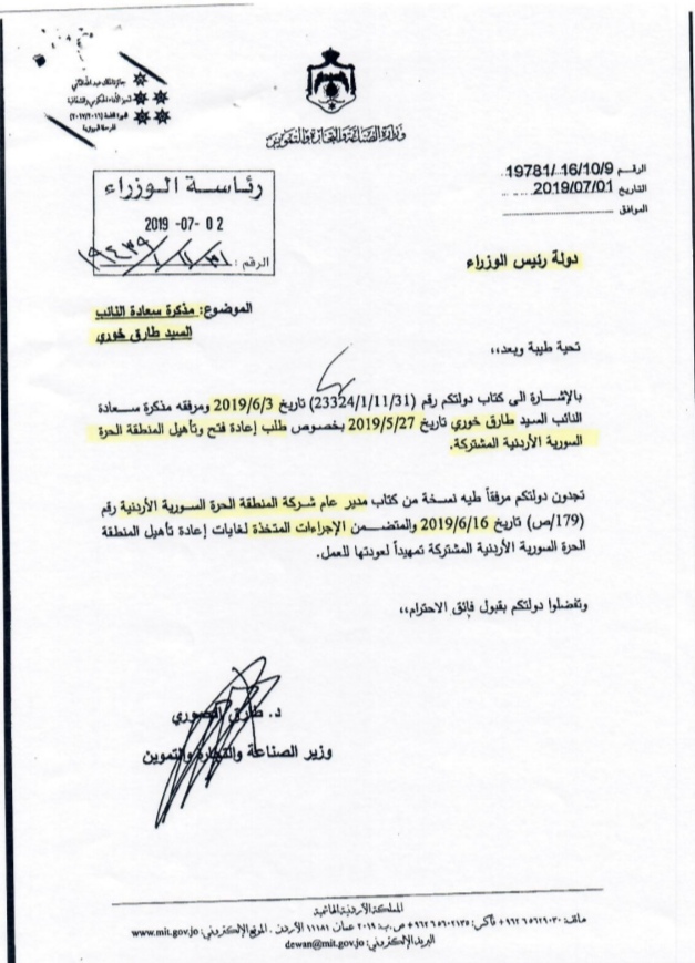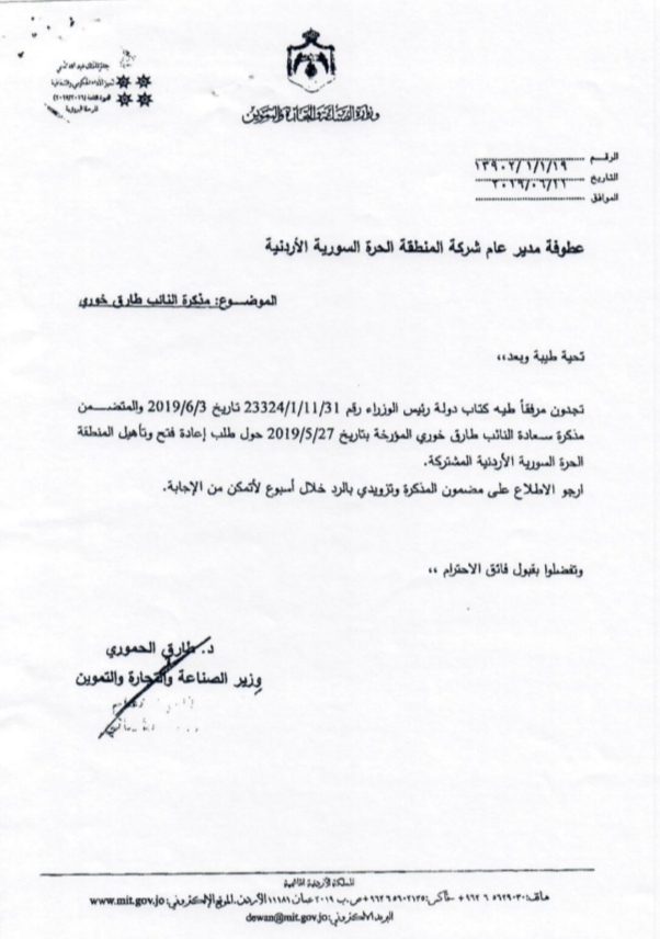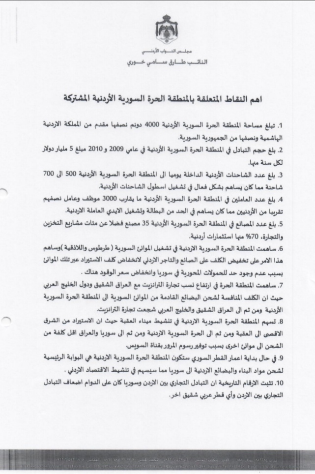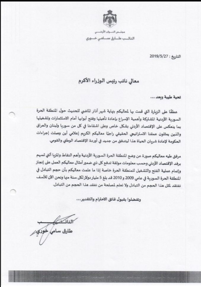 وكان النائب طارق خوري طال الحكومة إعادة تأهيل وفتح المنطقة الحرة السورية الأردنية منذ أيار الماضي في مكذرة نيابية وصلت رئيس الوزراء عمر الرزاز ما دعا مدير المنطقة تقديم شروحات كافية عن ذلك.