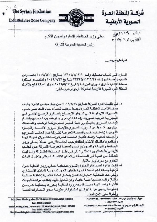 وقال وزير الصناعة والتجارة والتموين طارق الحموري، في وقت سابق، إن الوزارة دعت ممثلي الأردن في المنطقة الحرة الأردنية السورية المشتركة إلى البدء بإجراءات تفعيل المنطقة، وإعادة الشركات للعمل بداخلها.