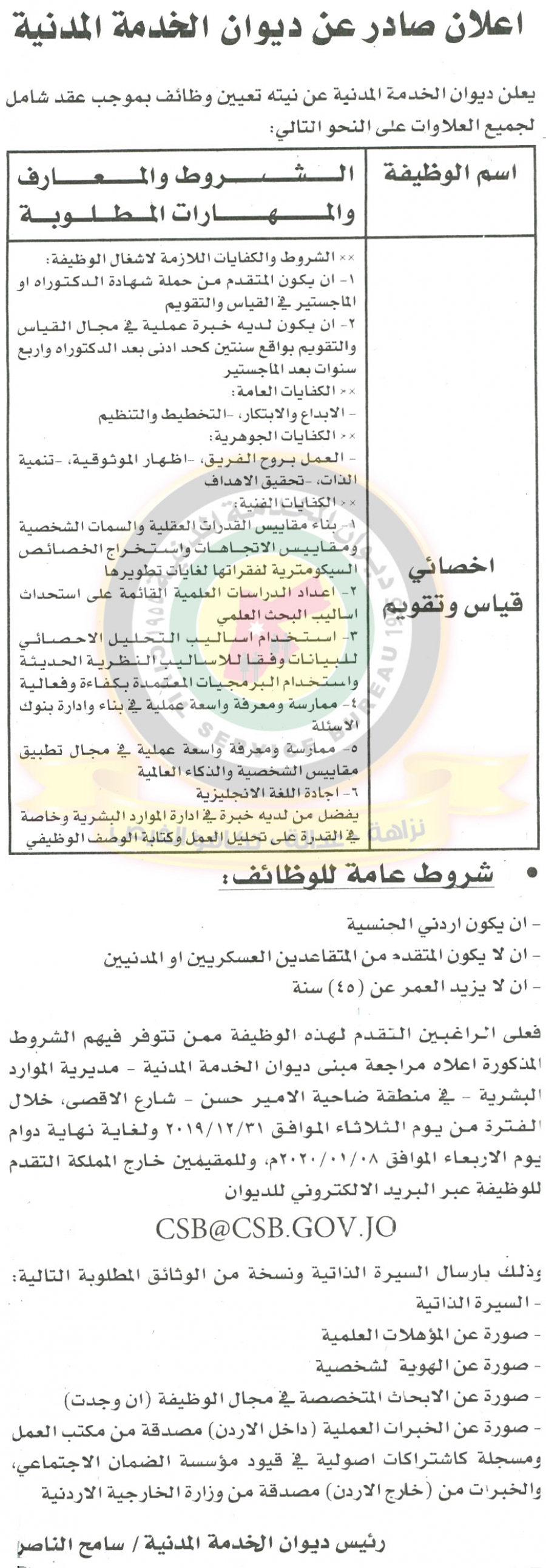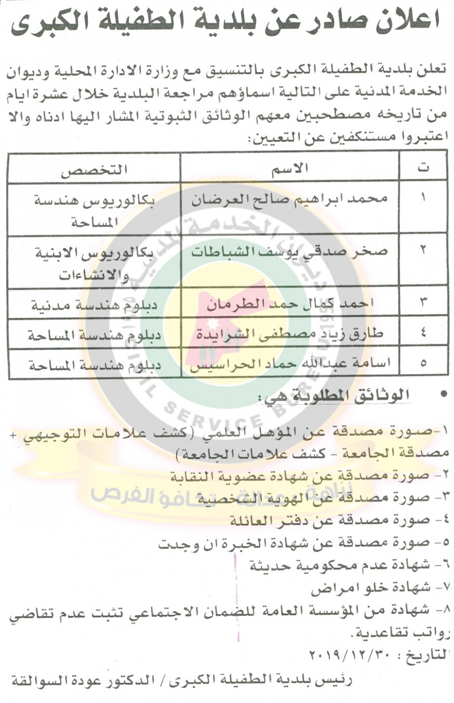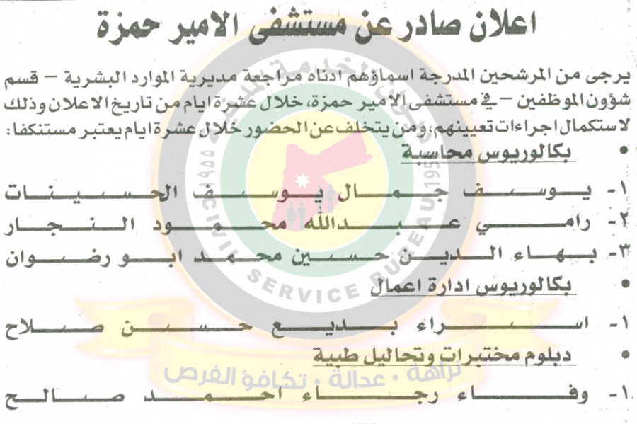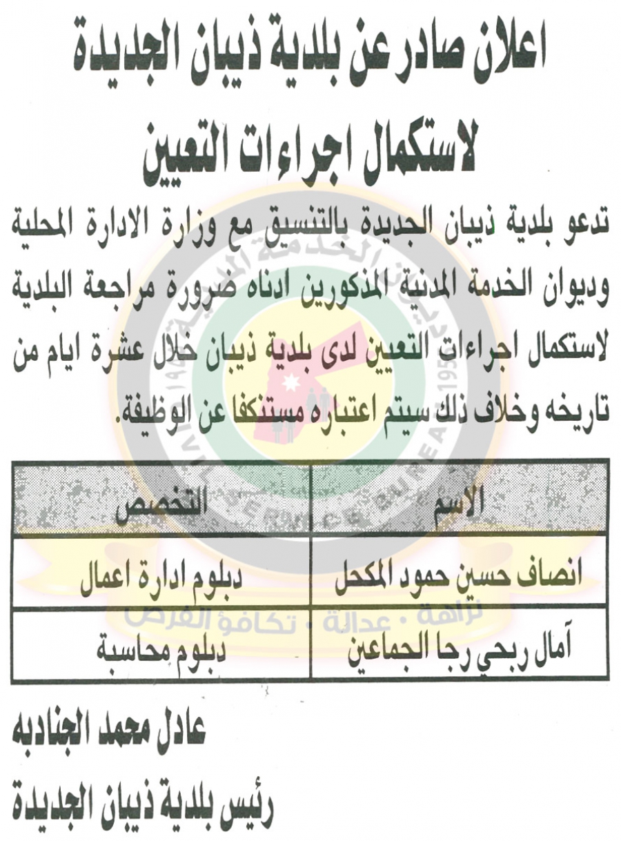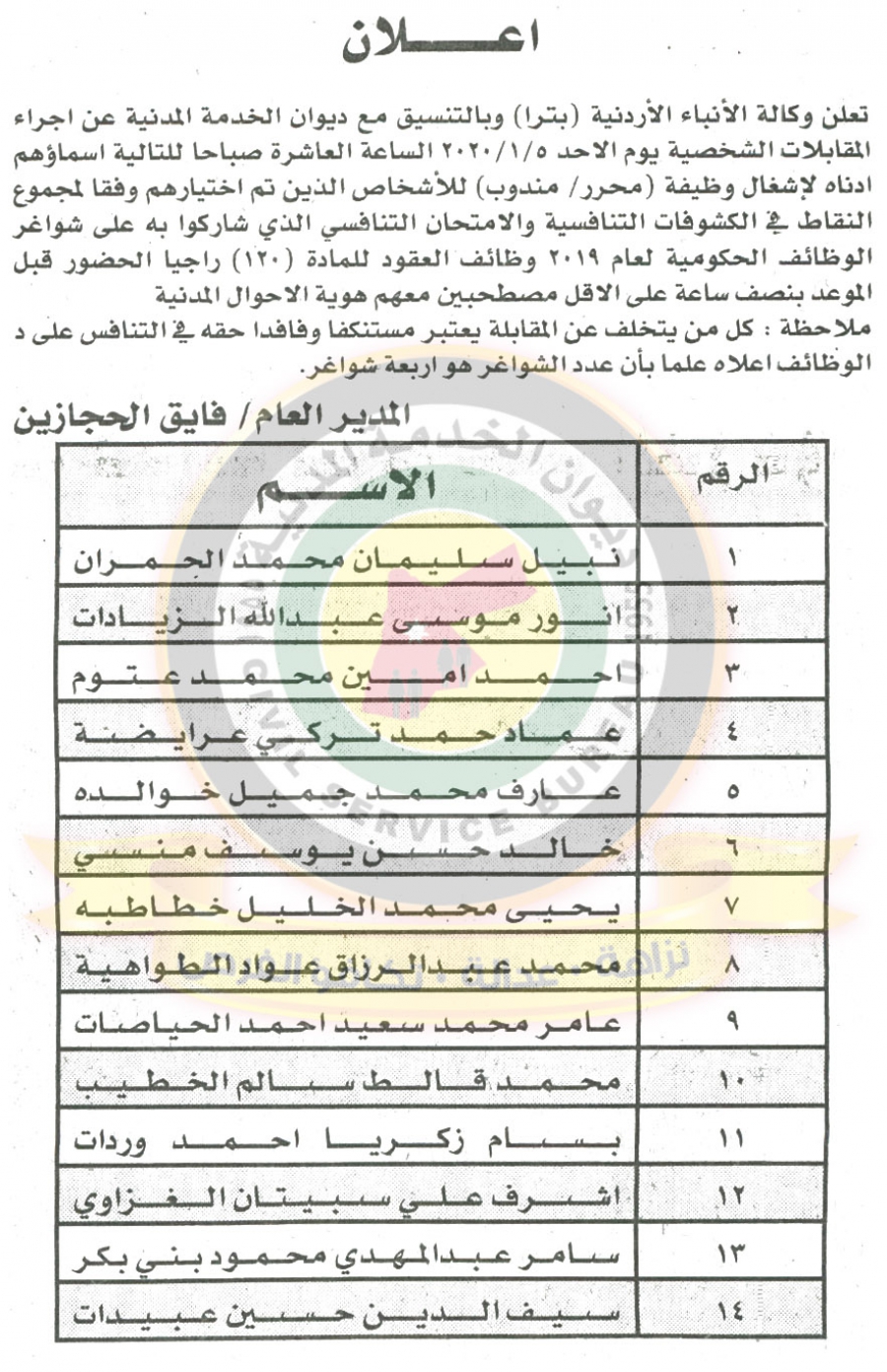 أحداث اليوم - دعا ديوان الخدمة المدنية بالتعاون مع مختلف الوزارات والمؤسسات الحكومية، التالية اسماؤهم لاجراء المقابلات الشخصية وعقد الامتحان التنافسي لغايات التعيين.