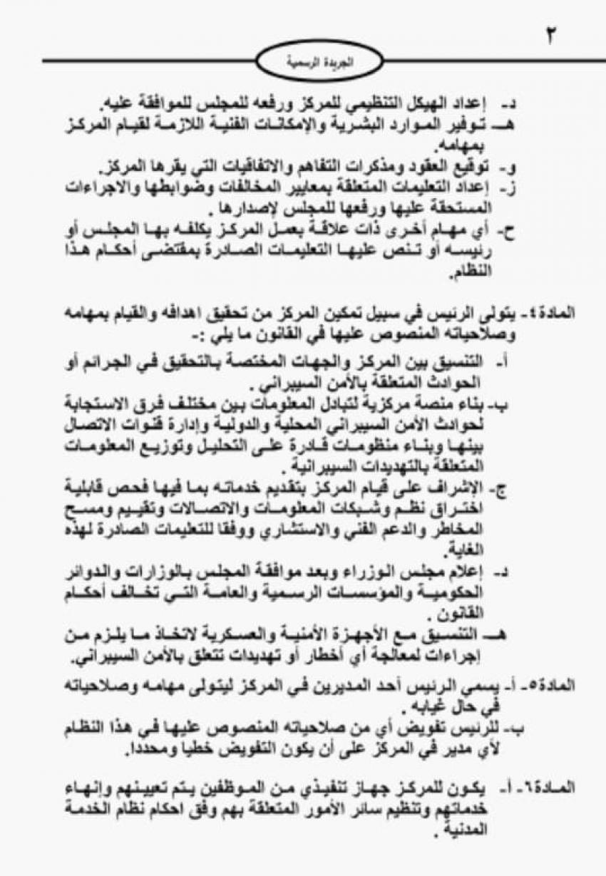 أحداث اليوم - صدرت الإرادة الملكية في عدد الجريدة الرسمية الخميس بوضع نظام المركز الوطني للأمن السيبراني.ويدخل النظام حيز التنفيذ بعد 24 ساعة من نشره في الجريدة الرسمية.وفي ما يلي نص النظام: