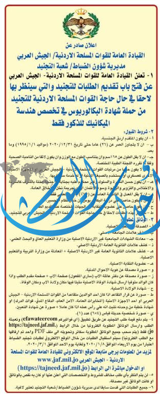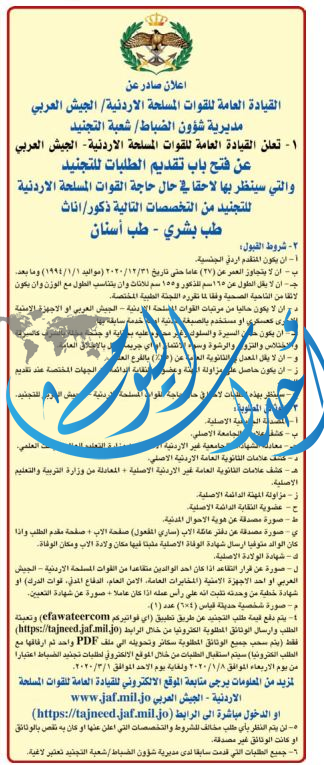 أحداث اليوم - أعلنت القيادة العامة للقوات المسلحة - الجيش العربي، عن فتح باب التجنيد لبعض التخصصات، للذكور والاناث.