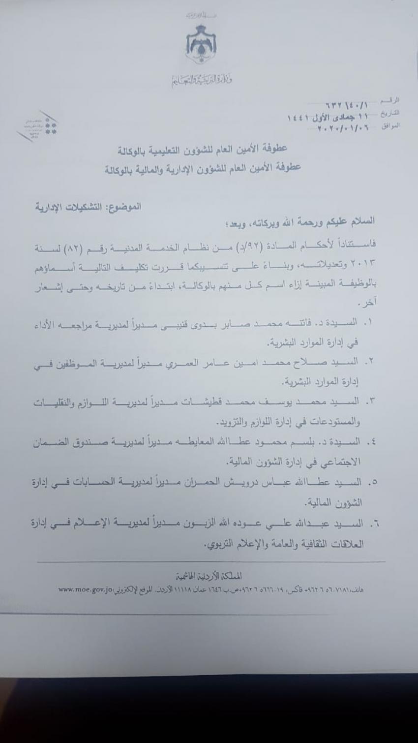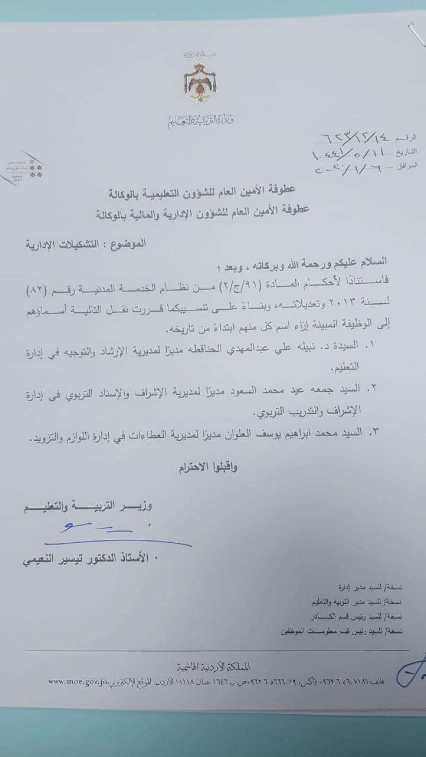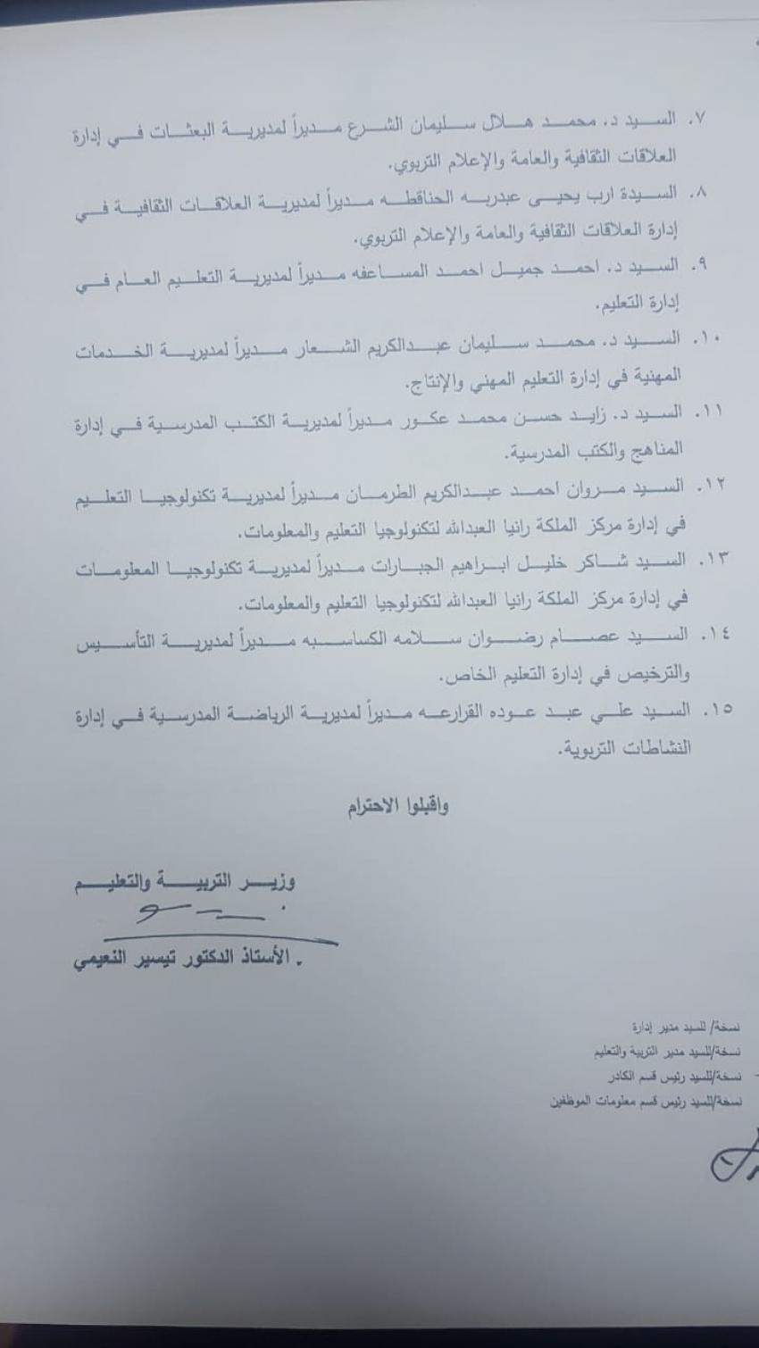 قرر وزير التربية والتعليم الدكتور تيسير النعيمي اجراء تشكيلات إدارية في الوزارة.وشملت التشكيلات تعيين 15 مديرا في الوزارة.وتاليا الأسماء: