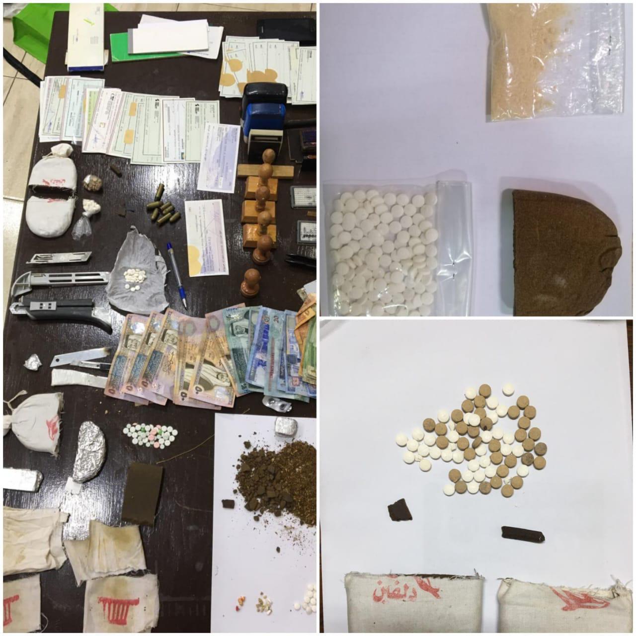 وفي محافظة العقبة القي القبض على اربعة اشخاص بعد مداهمة احد المنازل وضبط بحوزتهم 13 كفاً من مادة الحشيش المخدرة و5000الاف حبة مخدرة .