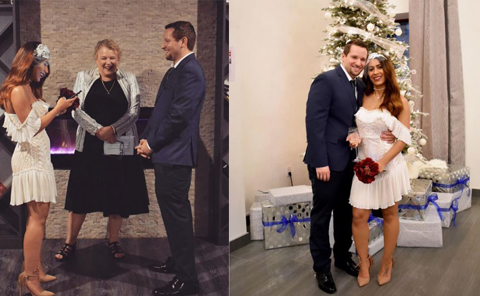 ونشرت السعودية "جوجو" عددا من الصور التي جمعتها بخطيبها الأميركي، كما نشرت صورا من حفل الزفاف الذي اختارت أن ترتدي فيه فستانا أبيض قصيرا جدا ومفتوحا من ناحية الأكتاف والصدر.
