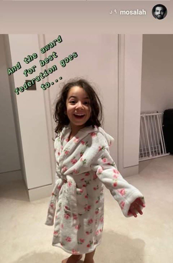 ونشر صلاح صورة عبر الإستوري بحسابه على موقع "إنستجرام" لابنته مكة وهي تضحك، وعلق عليها: "وجائزة أفضل اتحاد ذهبت إلى ...".