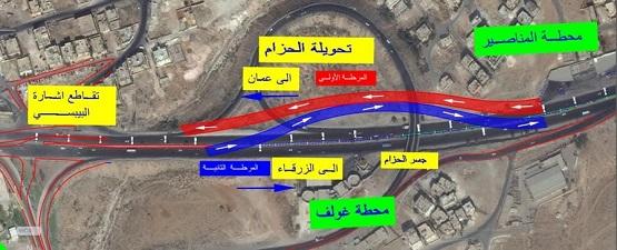 تبدأ اعتبارا من ظهر يوم السبت الموافق 11/01/2020 ويتم تحويل السير القادم من عمان الى الزرقاء بعد الاشارة الضوئية على تقاطع الحزام البوليتكنك باتجاه التحويلة الجديدة يسار جسر الحزام .