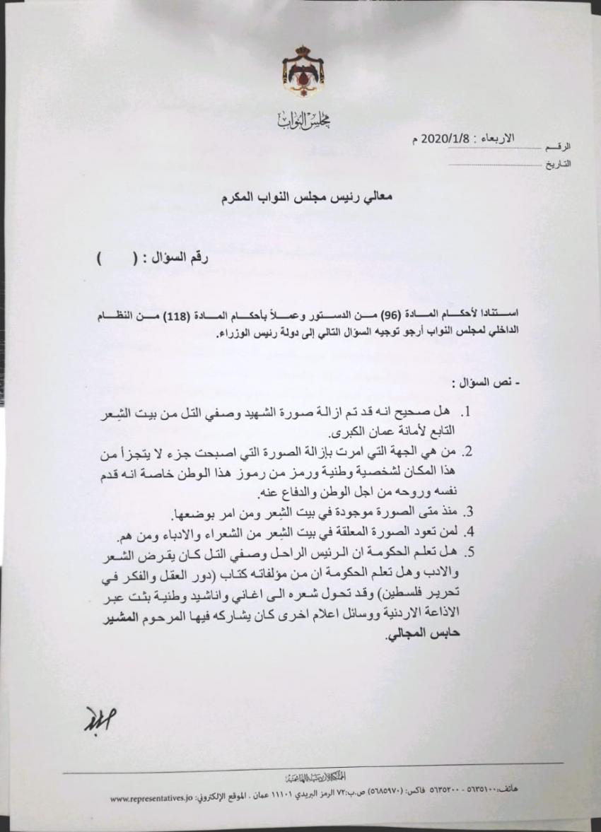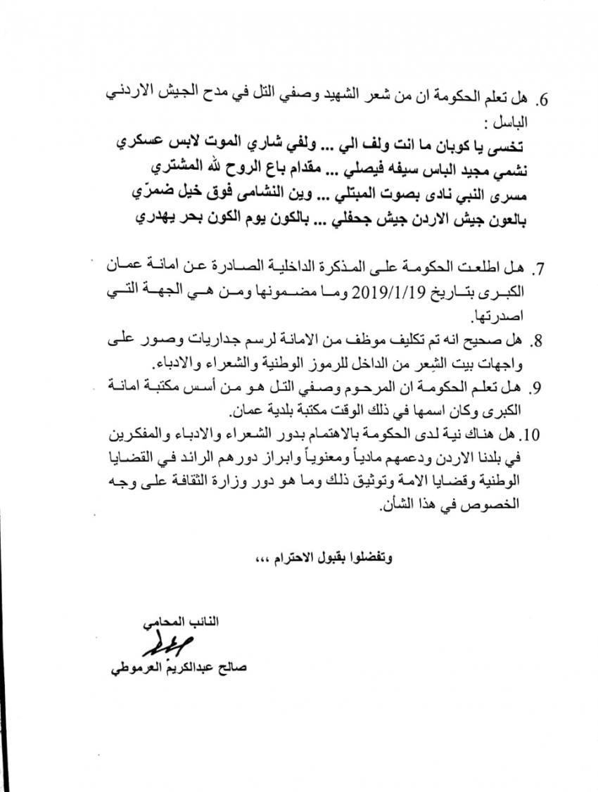 وقال العرموطي في سؤاله، "هل صحيح أنه تم ازالة صورة الشهيد وصفي التل من بيت الشعر التابع لامانة عمان الكبرى؟، ومن هي الجهة التي امرت بازالة الصورة؟.