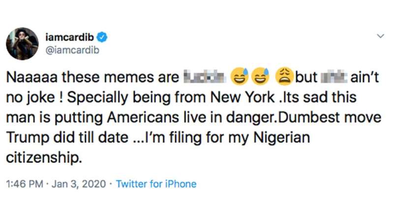 وأضافت كاردي بي أنها لم تعد تريد الجنسية الأمريكية، بسبب الحماقات التي يرتكبھا دونالد ترامب والجرائم الوحشیة في إيران، حسب وصفھا.