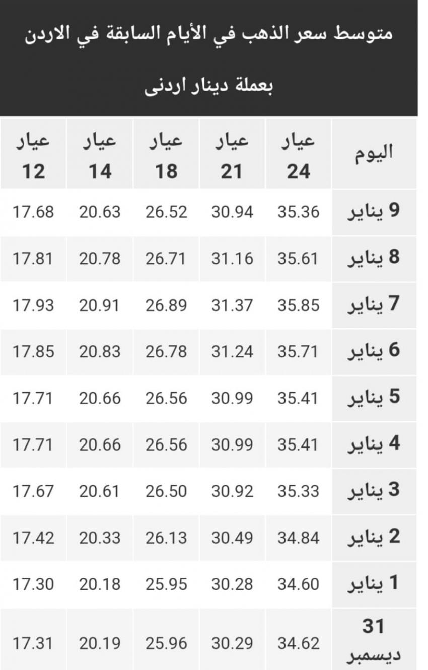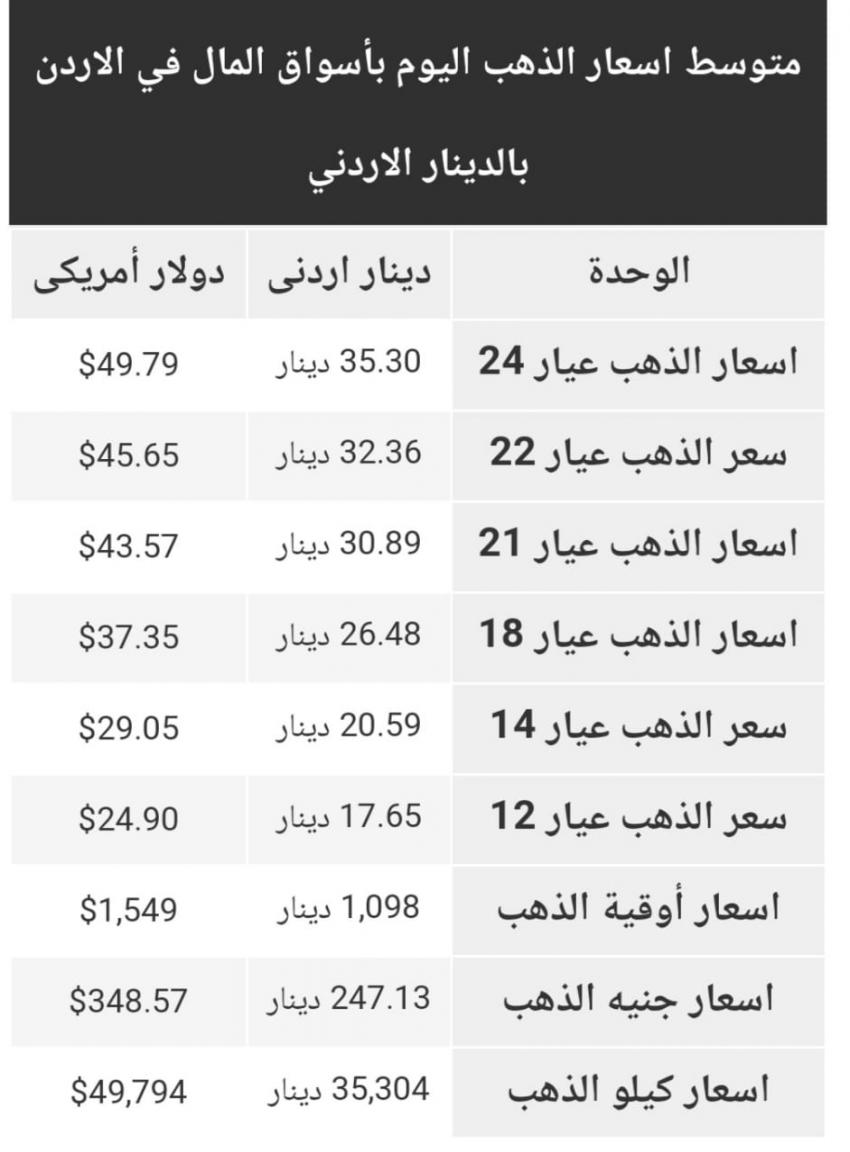 وتحتوي أيضا على مخطط بمعدل الارتفاع والانخفاض في أسعار الذهب اليوم في الأردن في الأيام السابقة في السوق الأردني.