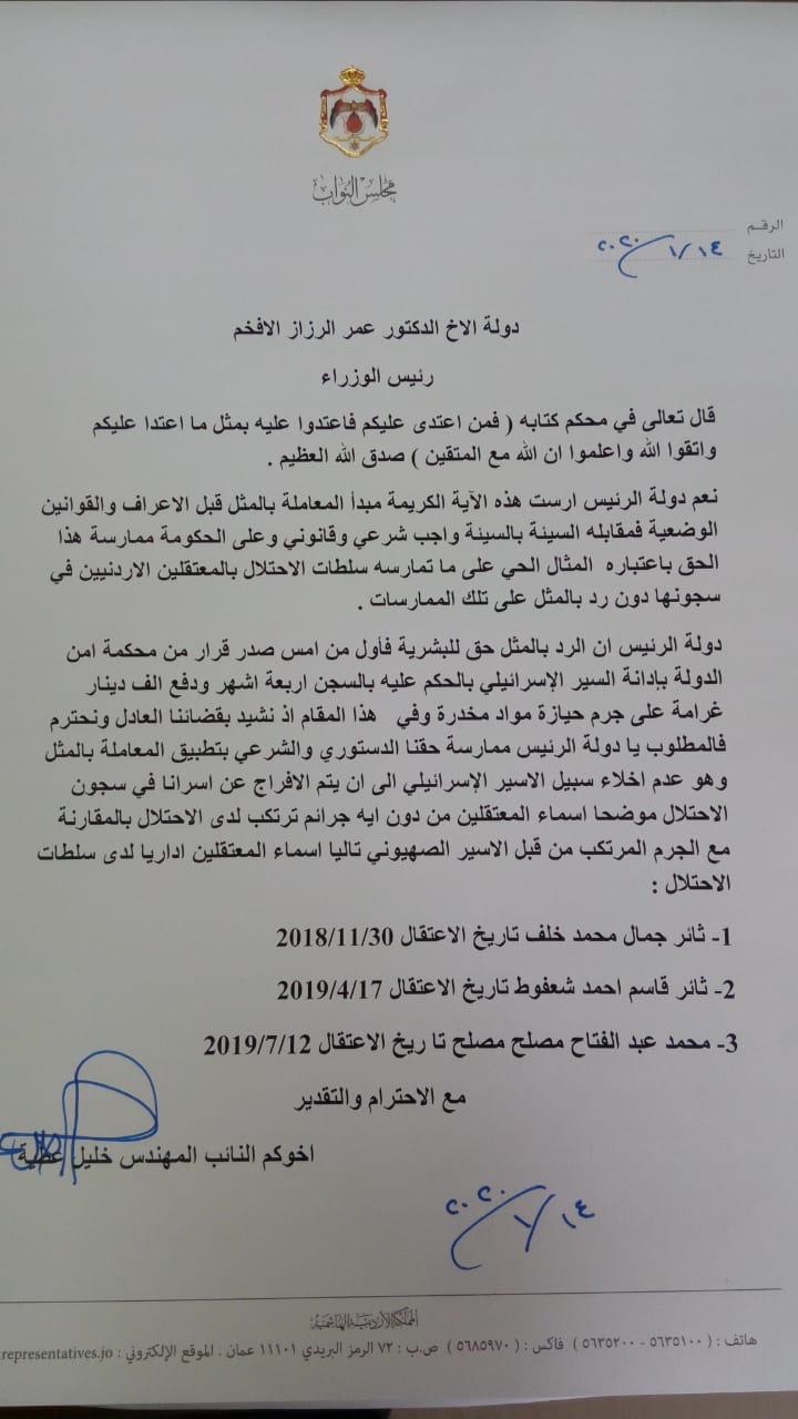 وقال عطية، في رسالة إلى الرزاز ووصلت لـ"أحداث اليوم"، نسخة عنها، إنه لا يجب الإفراج عن المتسلل الإسرائيلي قبل الإفراج عن المعتقلين الأردنيين.