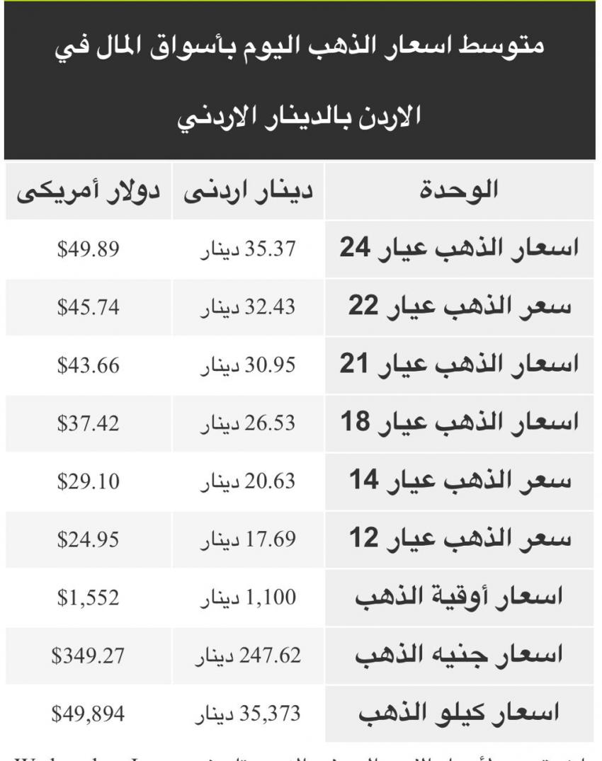 أحداث اليوم - التقرير الدوري والمتجدد لأسعار معدن الذهب اليوم في الأردن بالدينار وأيضا الدولار الأمريكي.