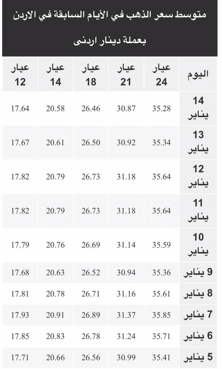 ويشمل التقرير أسعار المعدن بجميع عياراته (عيار 24, 22, 18, 14, 12) في الاردن.