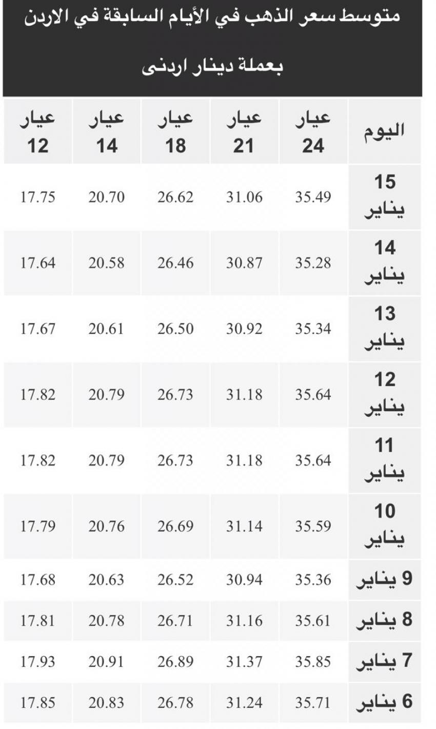 ويشمل التقرير أسعار المعدن بجميع عياراته (عيار 24, 22, 18, 14, 12) في الاردن.