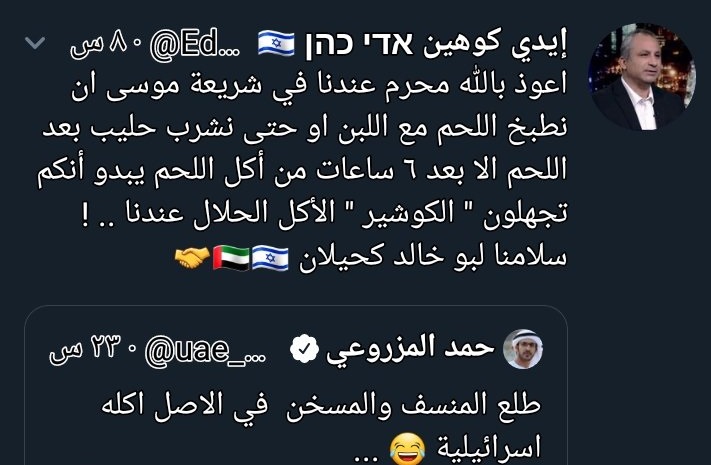 ورد عليه الصحفي الإسرائيلي إيدي كوهين قائلا: "اعوذ بالله محرم عندنا في شريعة موسى ان نطبخ اللحم مع اللبن او حتى نشرب حليب بعد اللحم الا بعد ٦ ساعات من أكل اللحم يبدو أنكم تجهلون " الكوشير " الأكل الحلال عندنا .. ! سلامنا لبو خالد كحيلان".