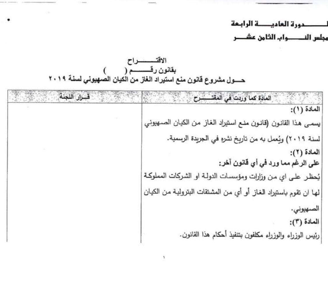 وبحسب المقترح النيابي يسمى القانون (قانون منع استيراد الغاز من الكيان الصهيوني لسنة 2019).