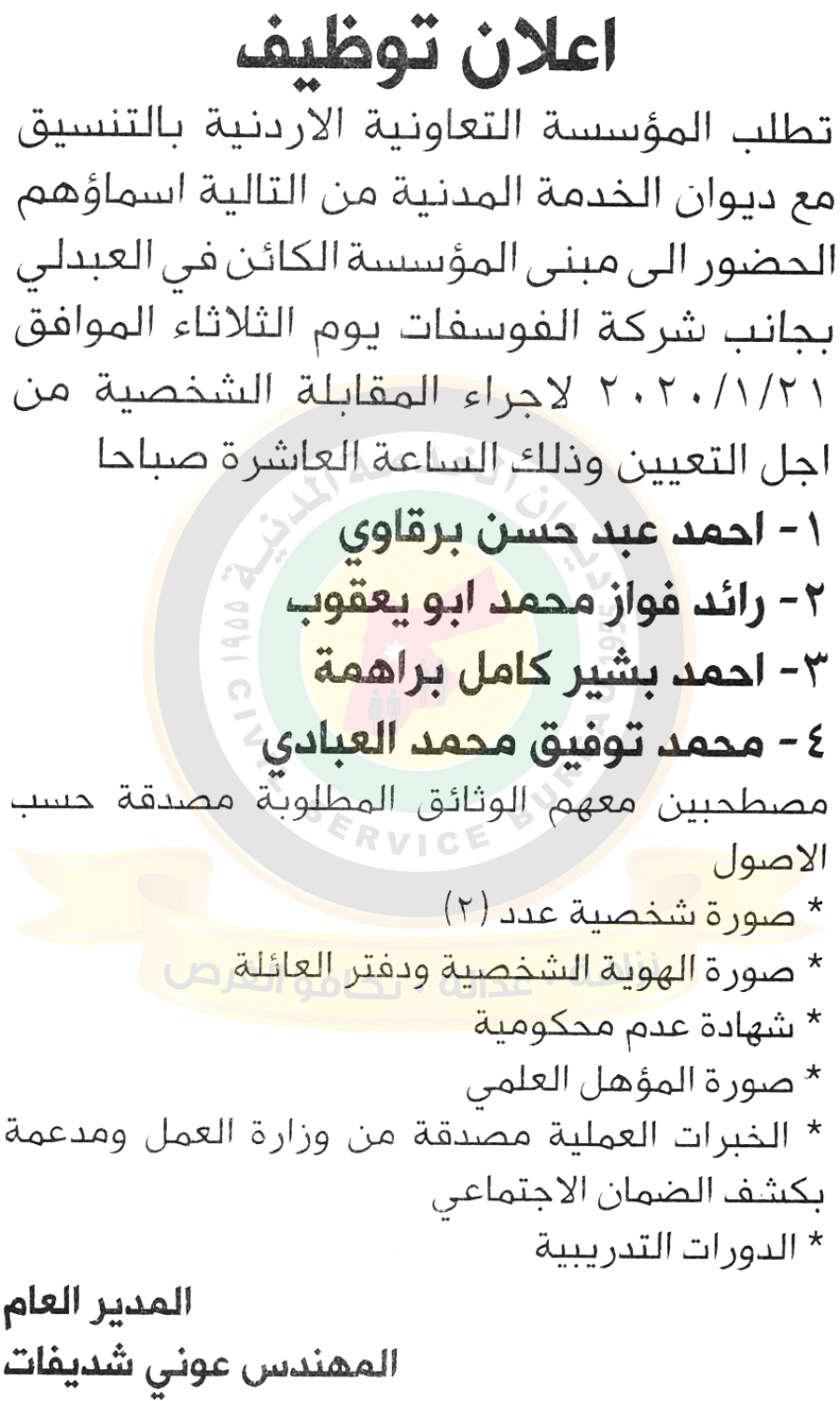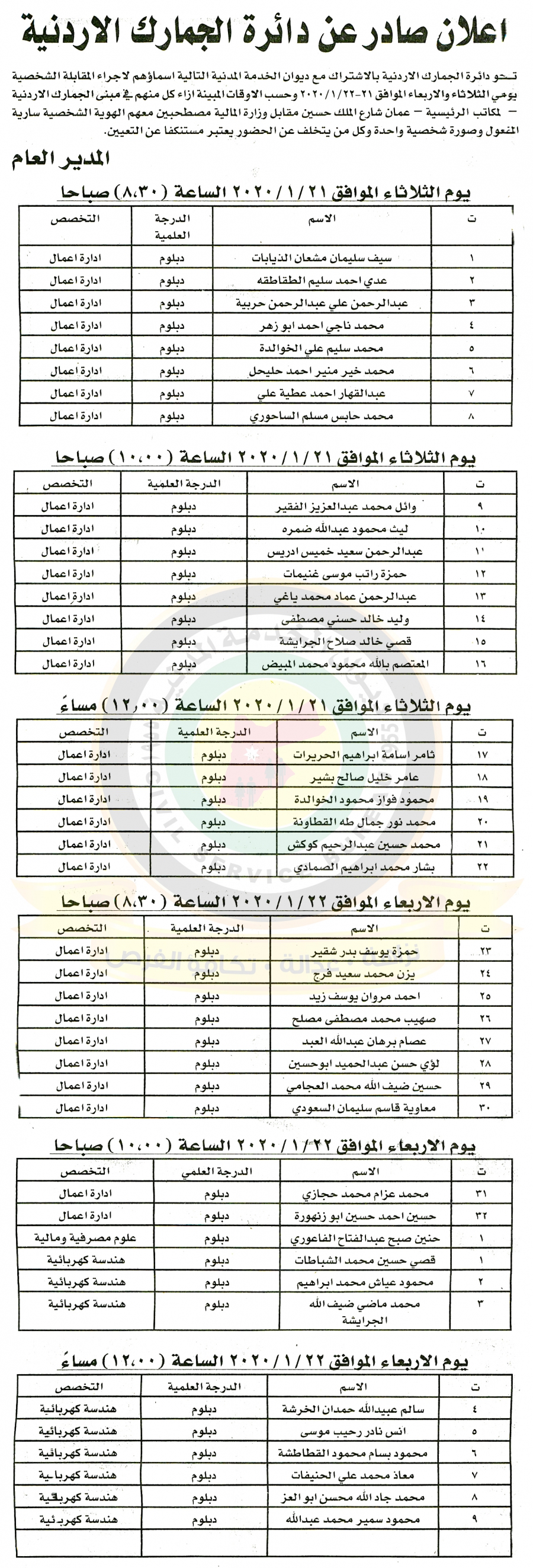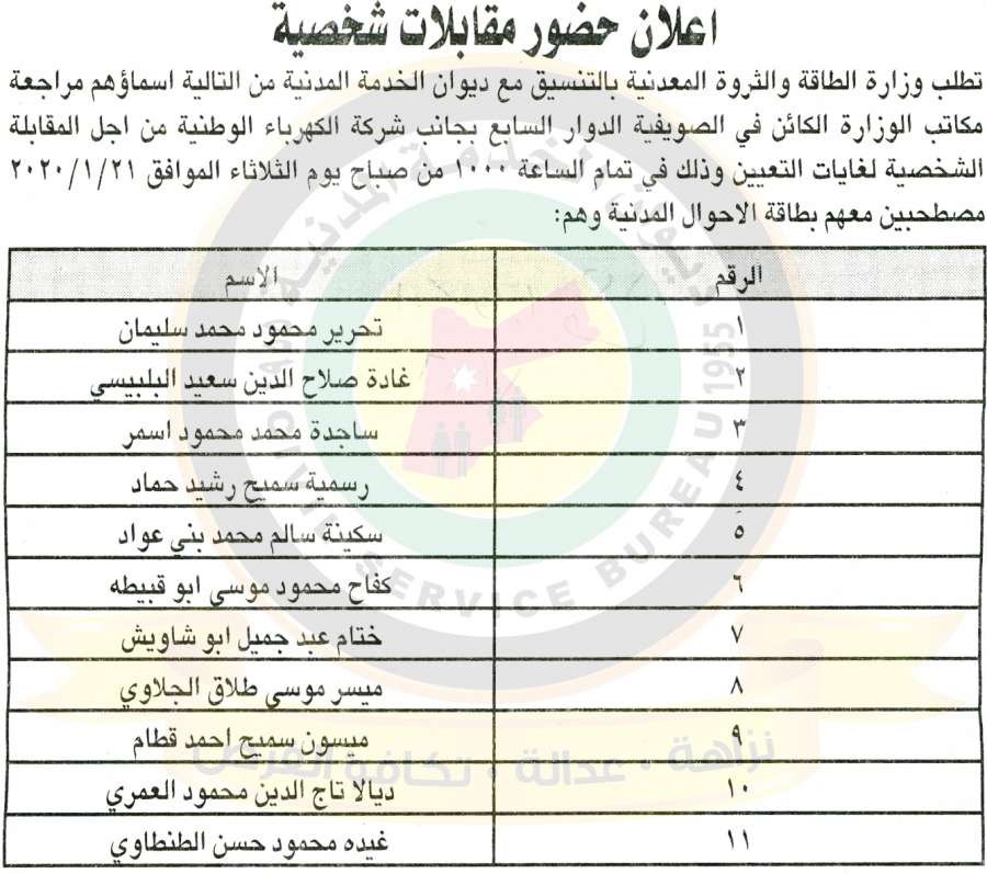 أحداث اليوم - دعا ديوان الخدمة المدنية بالتعاون مع مختلف الوزارات والمؤسسات الحكومية، التالية اسماؤهم لاجراء المقابلات الشخصية وعقد الامتحان التنافسي لغايات التعيين.