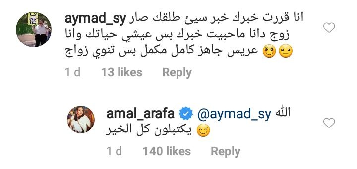 وفي أوّل تعليق لها على خبر الإرتباط، ردّت أمل عرفة على المعجب بالقول "الله يكتبلن كلّ الخير".