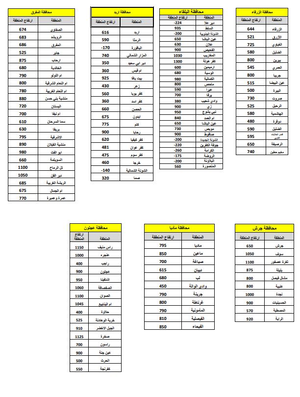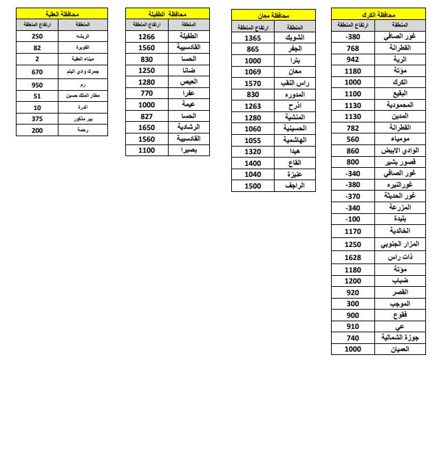 أحداث اليوم - يتوقع اعتباراً من ساعات الصباح الباكر من يوم الثلاثاء، تساقط زخات من الثلج بين الحين والآخر فوق المرتفعات الجبلية العالية والتي يصل ارتفاعها إلى 1000 متر عن سطح البحر.تاليا ارتفاع المناطق في الأردن: