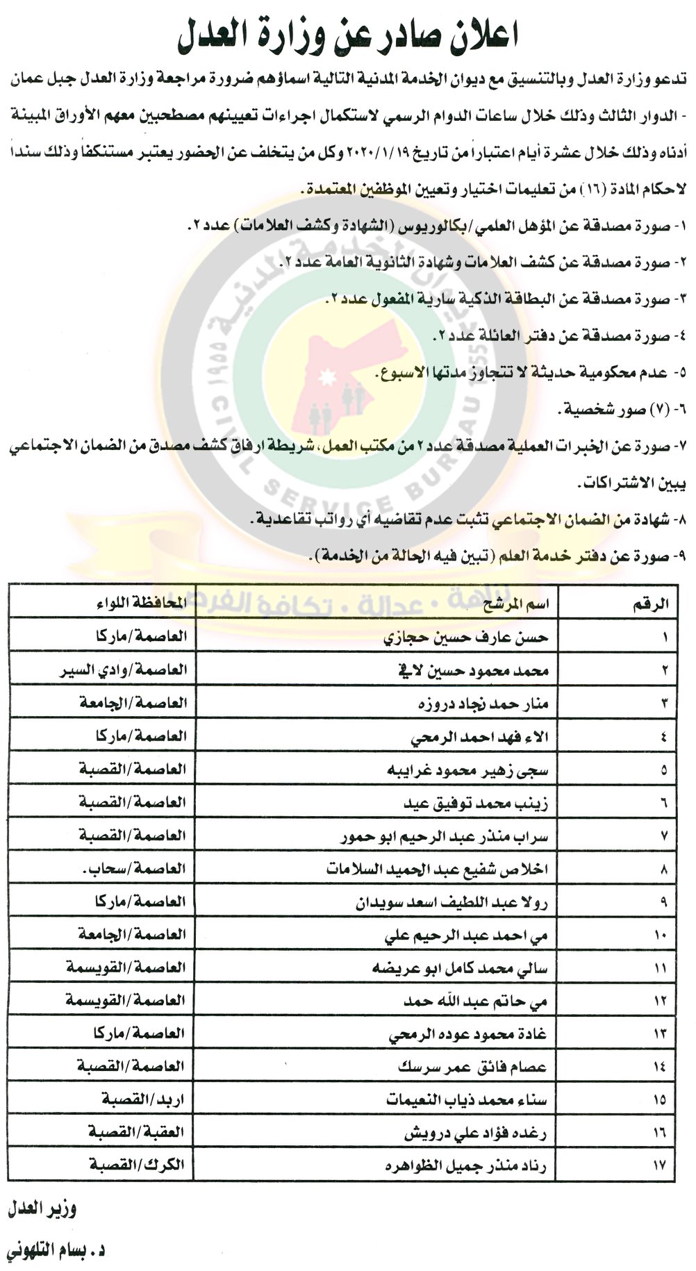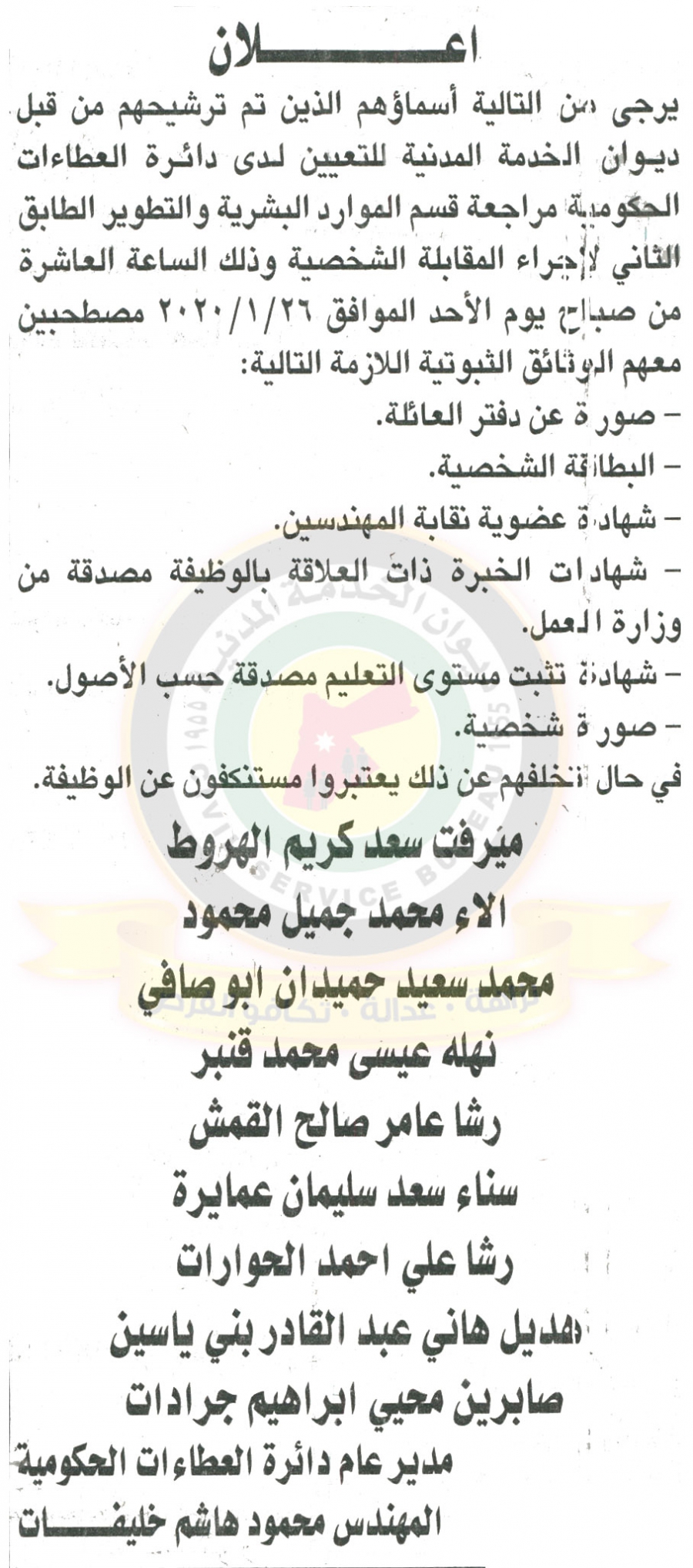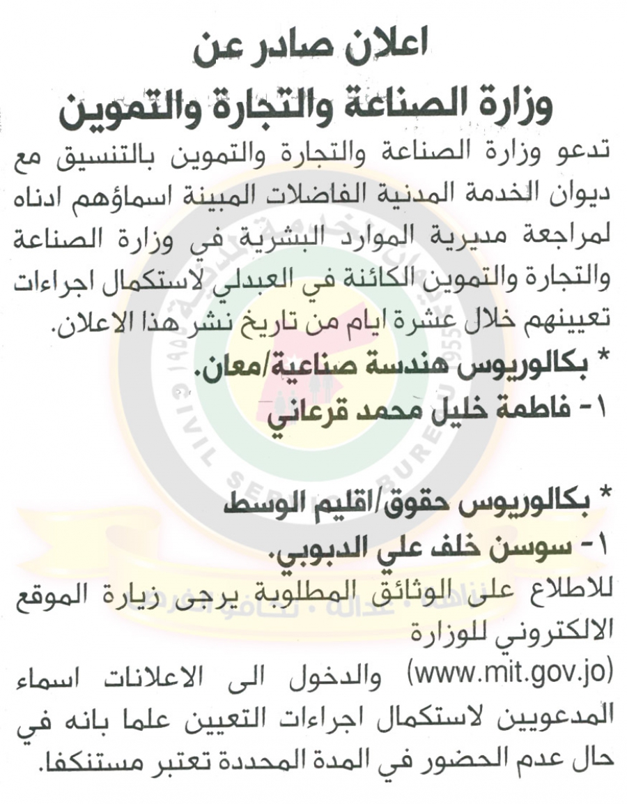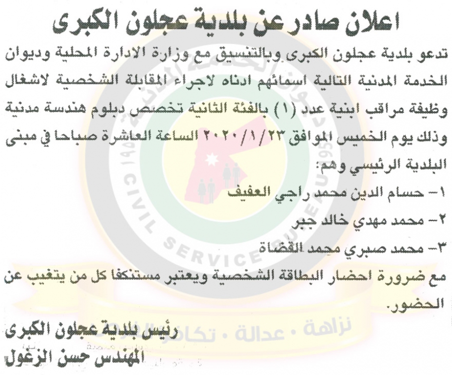 أحداث اليوم - دعا ديوان الخدمة المدنية بالتعاون مع مختلف الوزارات والمؤسسات الحكومية، التالية اسماؤهم لاجراء المقابلات الشخصية وعقد الامتحان التنافسي لغايات التعيين.