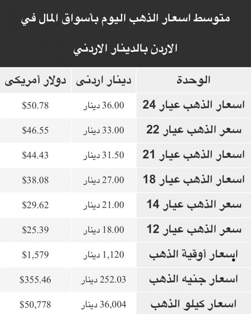 أحداث اليوم - التقرير الدوري والمتجدد لأسعار معدن الذهب الاثنين في الأردن بالدينار وأيضا بالدولار الأمريكي.