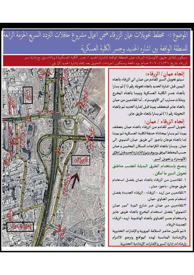 أحداث اليوم - أعلنت وزارة الأشغال العامة والإسكان عن تحويلات جديد للسير على اوتوستراد عمّان الزرقاء للمنطقة الواقعة بين اشارة الحديد وجسر الكلية العسكرية، ستبدأ اعتبارا من صباح يوم الجمعة الموافق 2020/1/31.