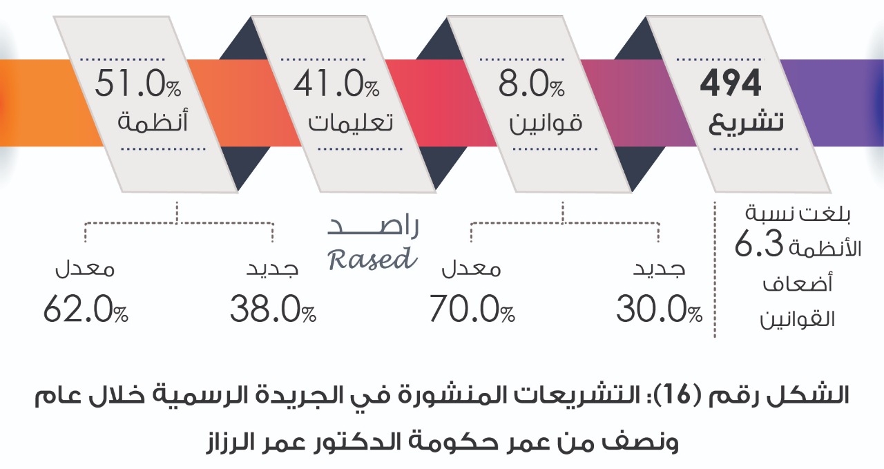وفي إضافة جديدة قدم التقرير تحليلاً للتشريعات التي نشرت في الجريدة الرسمية خلال عهد حكومة الرزاز حيث تبين ان الحكومة التزمت بإصدار وتعديل 23 تشريع نفذت 11 منها بشكل كامل وبدأت بتنفيذ 8 ولم تبدأ بتنفيذ 4 تشريعات، ولدى حصر فريق التقرير للتشريعات التي نشرت في الجريدة الرسمية بينت النتائج أنه تم نشر 494 تشريعاً في عهد حكومة الرزاز كان منها 8% عبارة عن قوانين و41% منها تعليمات و51% أنظمة، وبينت التحليلات أن 61% من القوانين والأنظمة التي نشرت في الجريدة الرسمية قد تم نشرها على موقع ديوان التشريع والرأي للمناقشة والمشاورة ولم يتم نشر 39% منها.