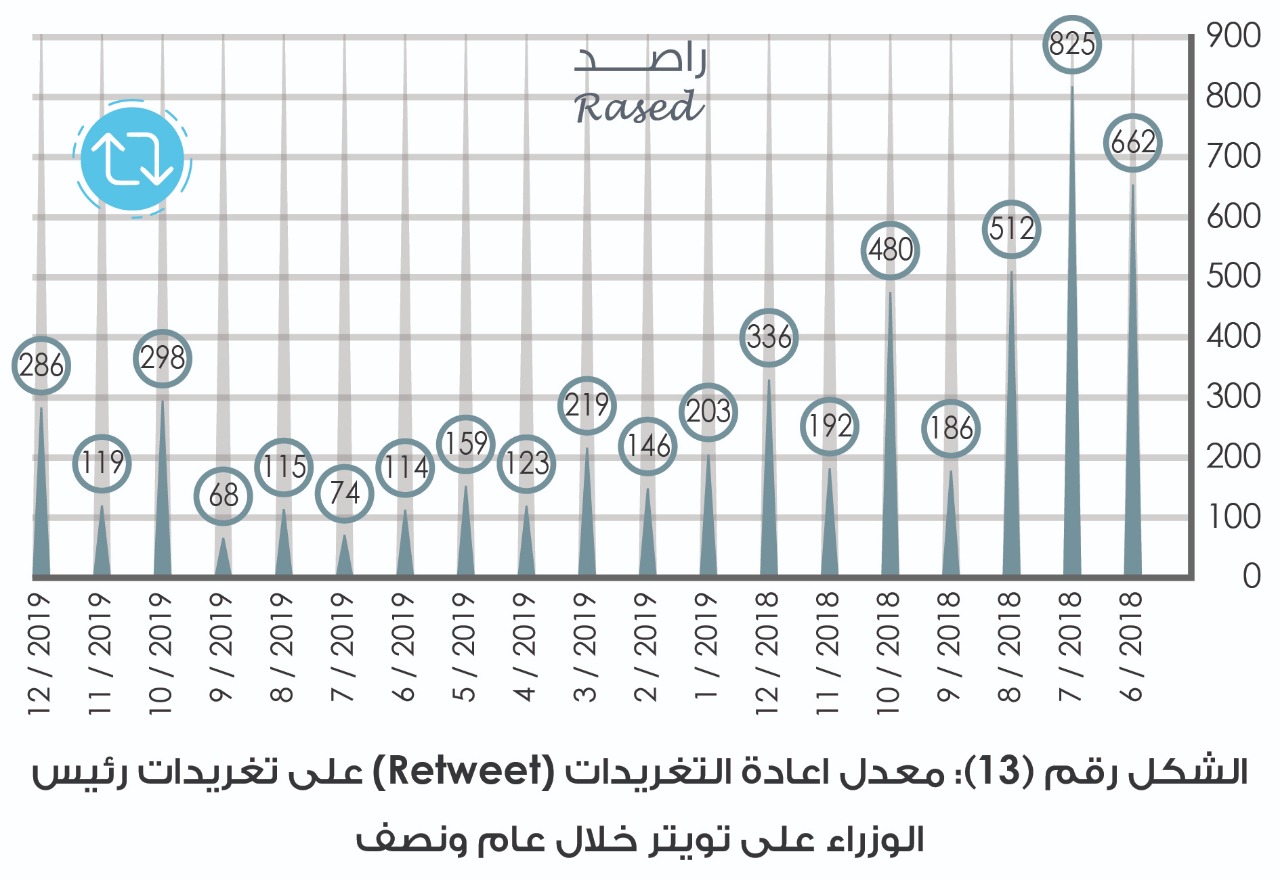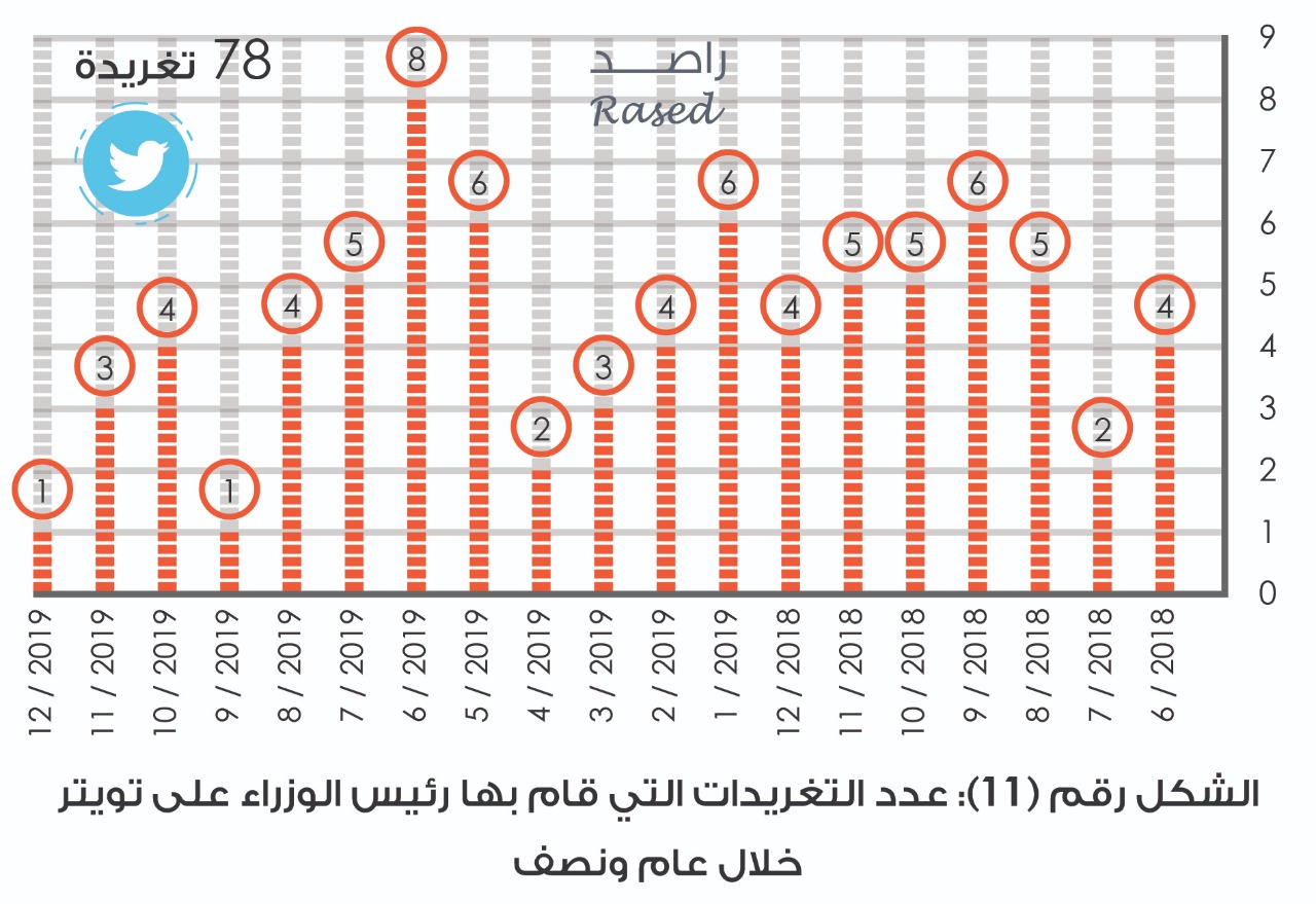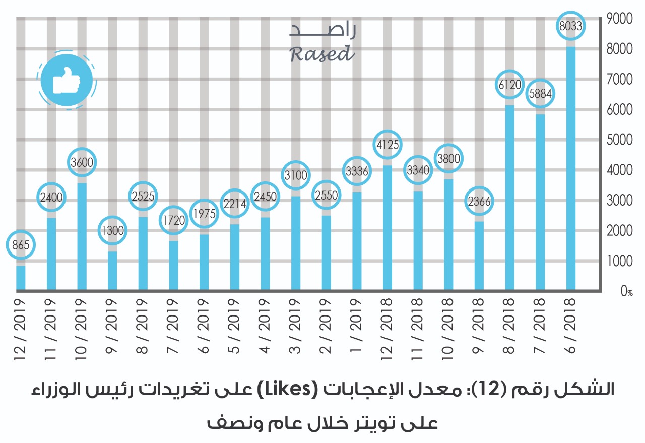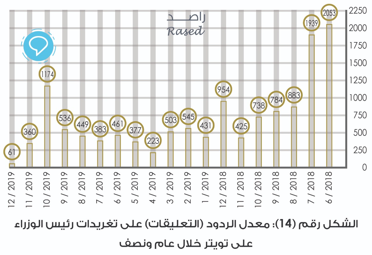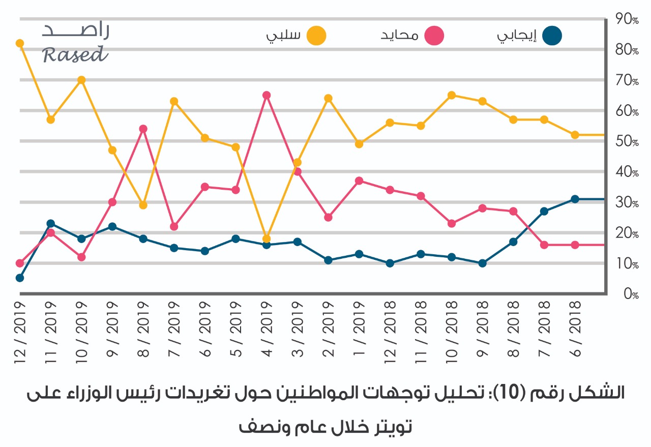 كما عمل فريق التقرير على تتبع الصفحة الرسمية لرئيس الوزراء عبر موقع تويتر وتحليلها حيث بينت النتائج انخفاض مستوى التعليقات ذات الطابع الإيجابي على تغريدات رئيس الوزراء بشكل ملموس من 31% في الشهر الأول لتوليه سلطاته الى 1% في شهر 12/2019 فيما ارتفعت نسبة التعليقات ذات الطابع السلبي من 52% الى ما يزيد عن 82%.