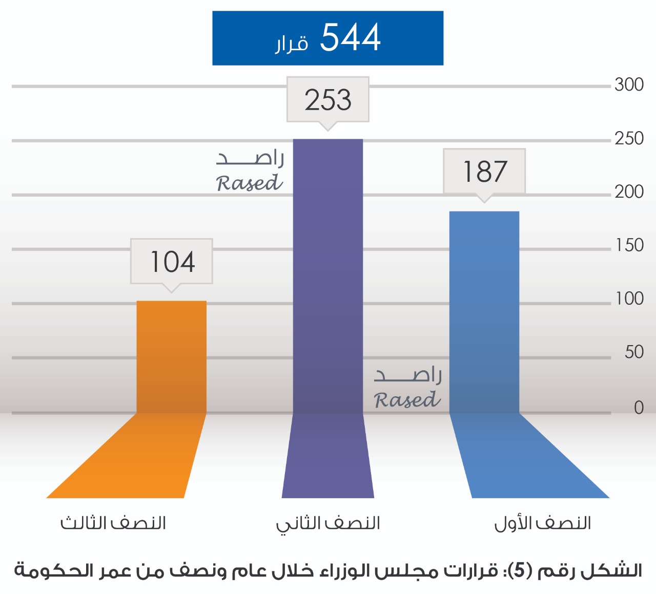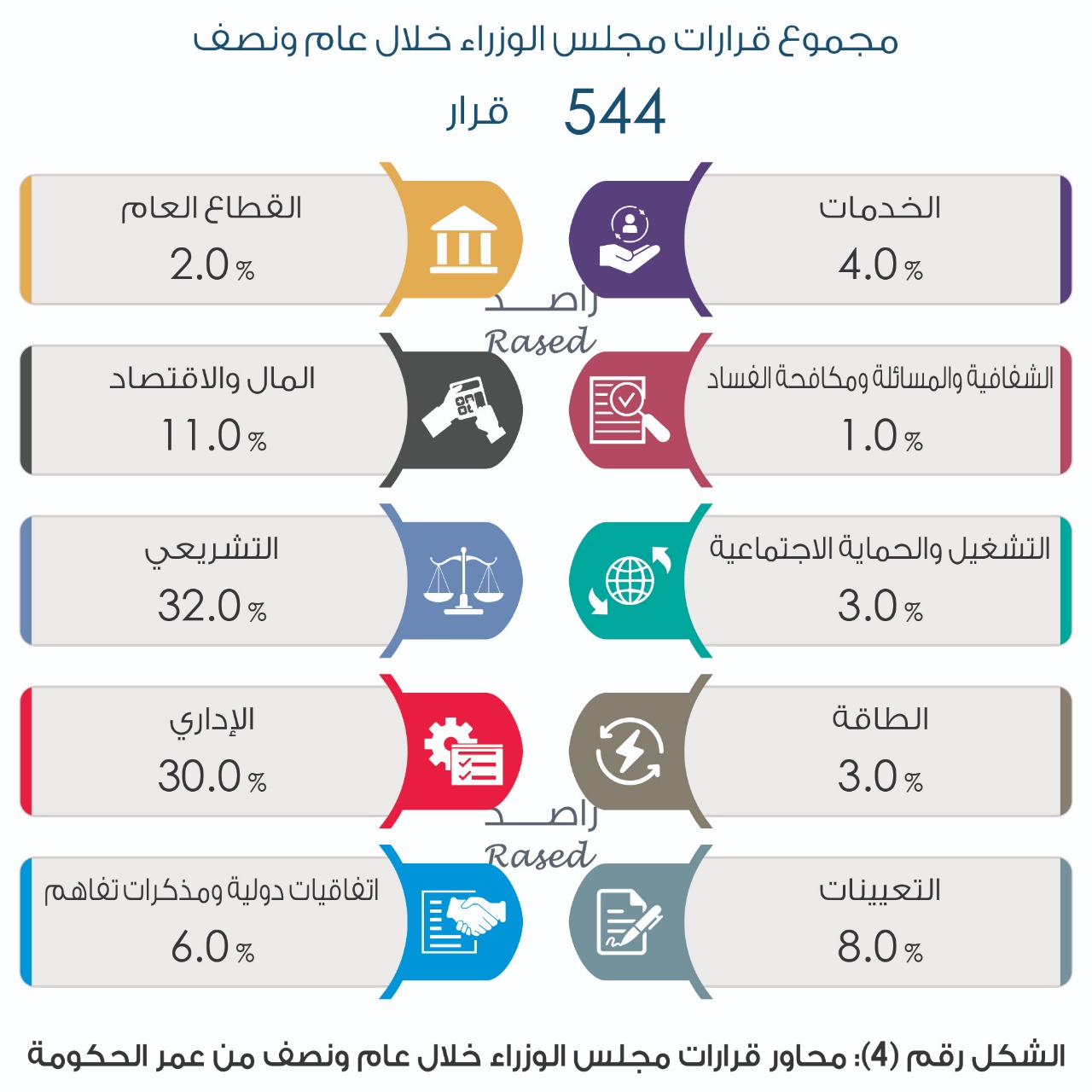 أما فيما يتعلق بقرارات مجلس الوزراء فقد بين التقرير أنه لا وجود لمصدر رسمي يجمع كافة قرارات مجلس الوزراء حيث عمل فريق التقرير على حصر القرارات المنشورة على الصفحة الرسمية لمجلس الوزراء وموقع الحكومة الالكترونية والتي بلغ عددها خلال عام ونصف 544 قراراٌ تم تصنيفها لمحاور متعددة، وكان أعلاها المحور التشريعي الذي حظي بما نسبته 32% من مجمل القرارات، و30% منها ضمن المحور الإداري تلاه محور المال والاقتصاد بنسبة 11% من القرارات ثم محور التعيينات بنسبة 8% وكان محور الشفافية والمساءلة المحور الأقل حظاً من قرارات مجلس الوزراء حيث بلغ نسبته 1% من مجمل القرارات، وبين التقرير انخفاض في عدد قرارات مجلس الوزراء إذا ما تمت مقارنة النصف الأول والنصف الثاني من العام 2019 حيث انخفضت من 253 قراراً في ستة شهور الى 104 قرار في الشهور الستة التي تلتها، وهنا يوصي راصد بضرورة اعتماد منصة واحدة يتم من خلالها أرشفة القرارات التي يتم إصدرها بحيث تكون صيغة القرارات على شكل نقاط واضحة تنسجم ومتطلبات مبدأ الشفافية الحكومية.