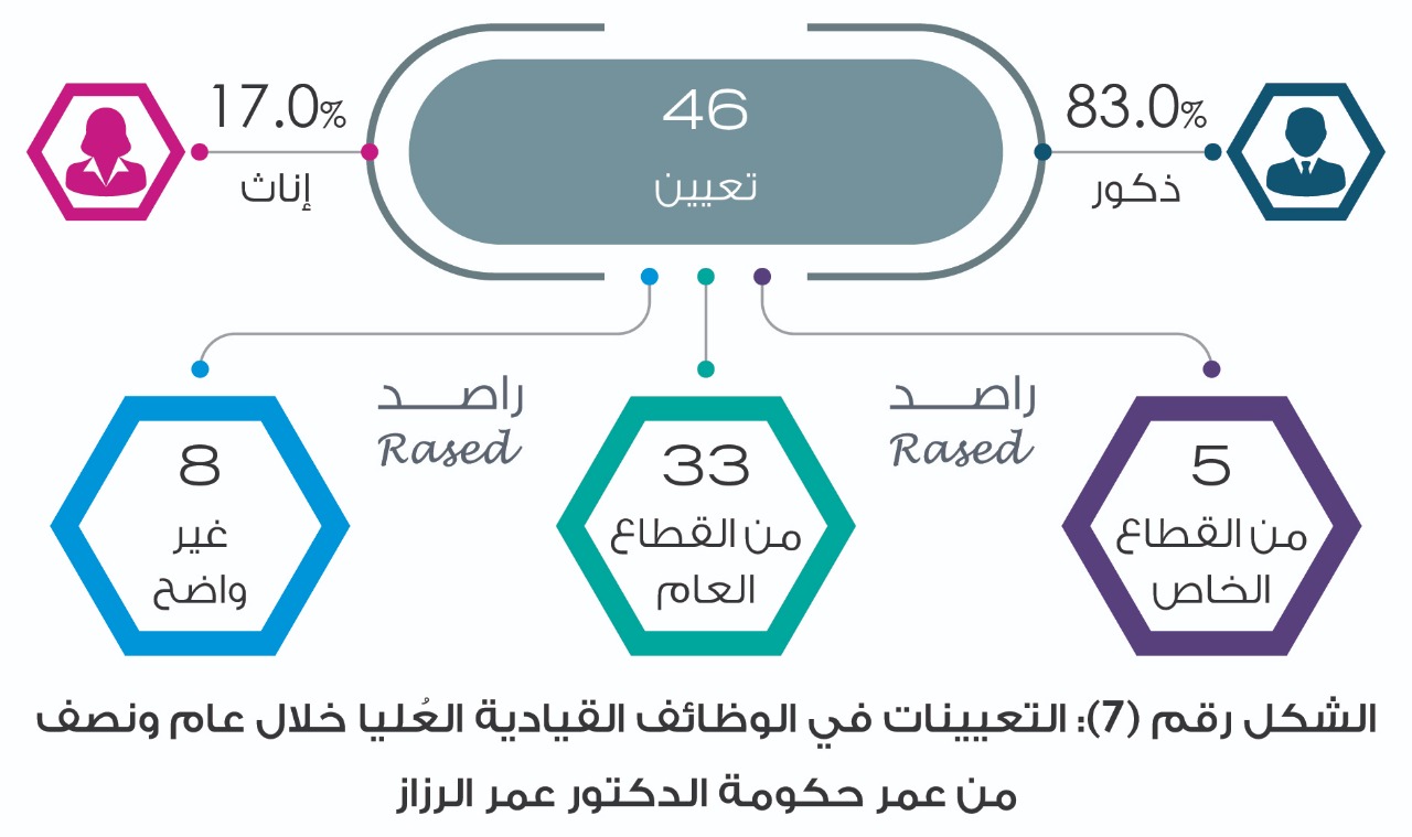 وبينت النتائج أن مجلس الوزراء أصدر 46 قرار تعيين في مناصب قيادية وعامة 83% منها حظي بها الذكور و17% للاناث وبتحليل السياق الوظيفي السابق للمعينين يتبين أن 5 أشخاص منهم قدموا من القطاع الخاص و33 شخص كانوا قد عملوا أو على رأس عملهم في القطاع العام.