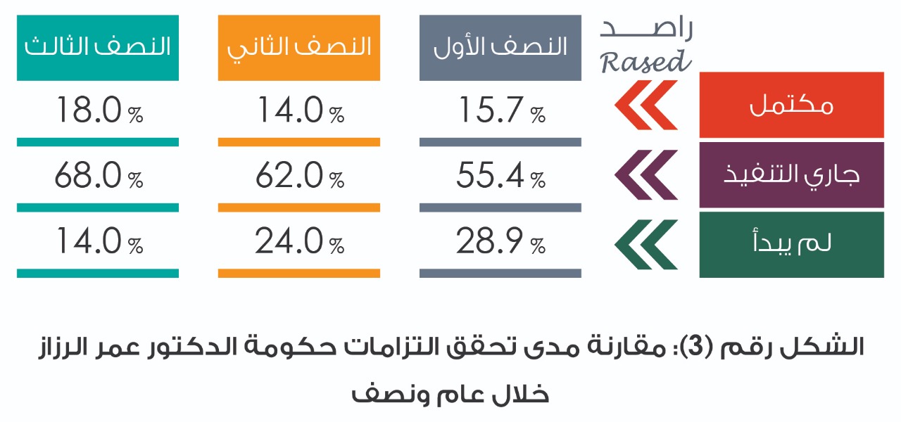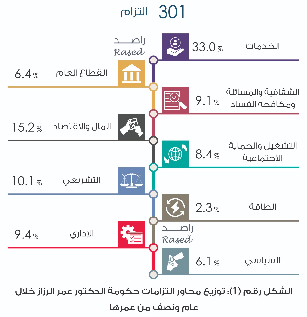 وقال بني عامر أن التقرير أظهر أن الحكومة التزمت ب 301 التزام خلال عام ونصف عمل فريق التقرير على حصرها من مصادر متعددة ابتداءً من البيان الحكومي الذي تم تلاوته في مجلس النواب لكسب الثقة ورد الحكومة على النواب وصولاً الى خطة أولويات الحكومة 2019-2020 إضافة لتتبع الالتزامات الواردة على لسان رئيس الحكومة في اللقاءات الاعلامية والزيارات الميدانية.