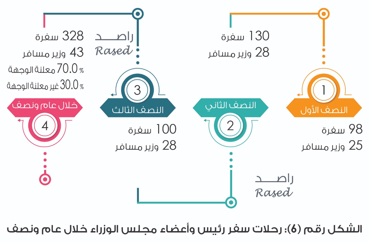 وعلى صعيد رحلات سفر أعضاء مجلس الوزراء فقد أظهر التقرير أن 43 وزيراً سافروا 328 رحلة سفر خلال عام ونصف من عمر الحكومة 70% منها معلنة الوجهة و30% غير معلنة دون معرفة أسباب السفر ومخرجاته، وهنا لا بد من التأكيد على أن المعلومات الخاصة بسفر الوزراء تم استخلاصها من الجريدة الرسمية.