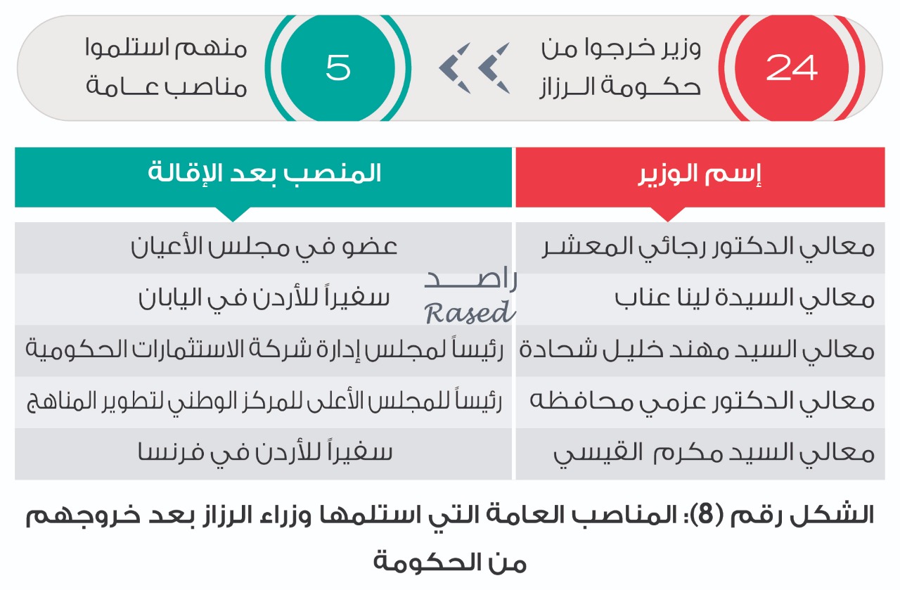كما أظهر التقرير أن 5 من الوزراء الذين غادروا حكومة الرزاز ضمن التعديلات قد تم تعيينهم في مناصب قيادية أوعامة بعد خروجهم من الحكومة وهم السيدة لينا عناب، السيد مهند شحادة، الدكتور عزمي محافظة، السيد مكرم القيسي والدكتور رجائي المعشر.