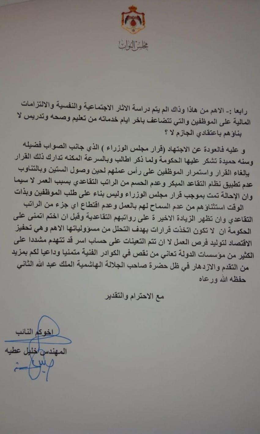 و عليه فالعودة عن الاجتهاد (قرار مجلس الوزراء ) الذي جانب الصواب فضيله وسنه حميدة تشكر عليها الحكومة ولما ذكر اطالب وبالسرعة المكنه تدارك ذلك القرار بإلغاء القرار واستمرار الموظفين على رأس عملهم لحين وصول الستين وبالتناوب عدم تطبيق نظام التقاعد المبكر وعدم الحسم من الراتب التقاعدي بسبب العمر لا سيما وان الإحالة تمت بموجب قرار مجلس الوزراء وليس بناء على طلب الموظفين وبذات الوقت استثناؤهم من عدم السماح لهم بالعمل وعدم اقتطاع اي جزء من الراتب التقاعدي وان تظهر الزيادة الاخير ة على رواتبهم التقاعدية وقبل ان اختم اتمنى على الحكومة ان لا تكون اتخذت قرارات بهدف التحلل من مسؤولياتها الاهم وهي تحفيز الاقتصاد لتوليد فرص العمل لا ان تتم التعينات على حساب اسر قد تتهدم مشددا على الكثير من مؤسسات الدولة تعاني من نقص في الكوادر الفنية متمنيا وداعيا لكم بمزيد من التقدم والازدهار في ظل حضرة صاحب الجلالة الهاشمية الملك عبد الله الثاني حفظه الله ورعاه