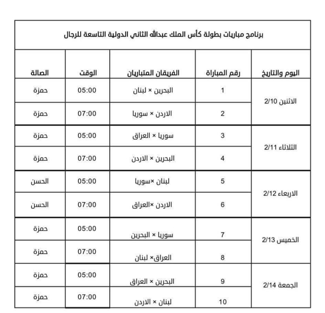 أحداث اليوم - أصدر اتحاد السلة برنامج مباريات بطولة كأس الملك عبدالله الثاني لكرة السلة بنسختها التاسعة، والتي تشارك فيها 5 منتخبات هي لبنان وسورية والعراق والبحرين إضافة إلى المنتخب الوطني.