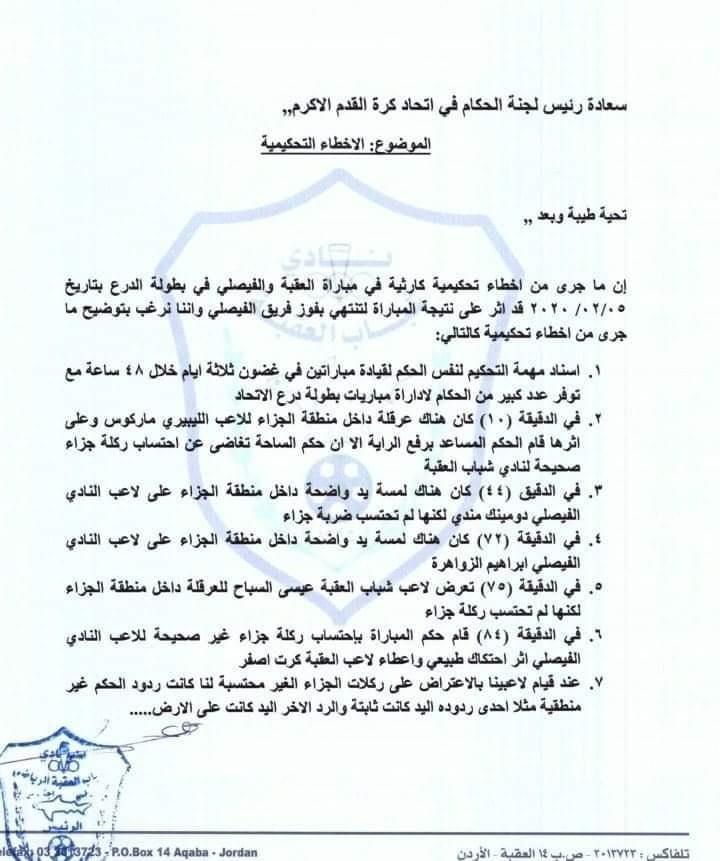 أحداث اليوم - رفع نادي شباب العقبة كتابا إلى الاتحاد الأردني لكرة القدم، الخميس، تضمن اعتراضا على "الأخطاء التحكيمية" خلال مباراته أمام فريق الفيصلي في بطولة درع الاتحاد، التي انتهت بفوز الأخير 0-1، ما أدى إلى خروج العقبة من المنافسات.