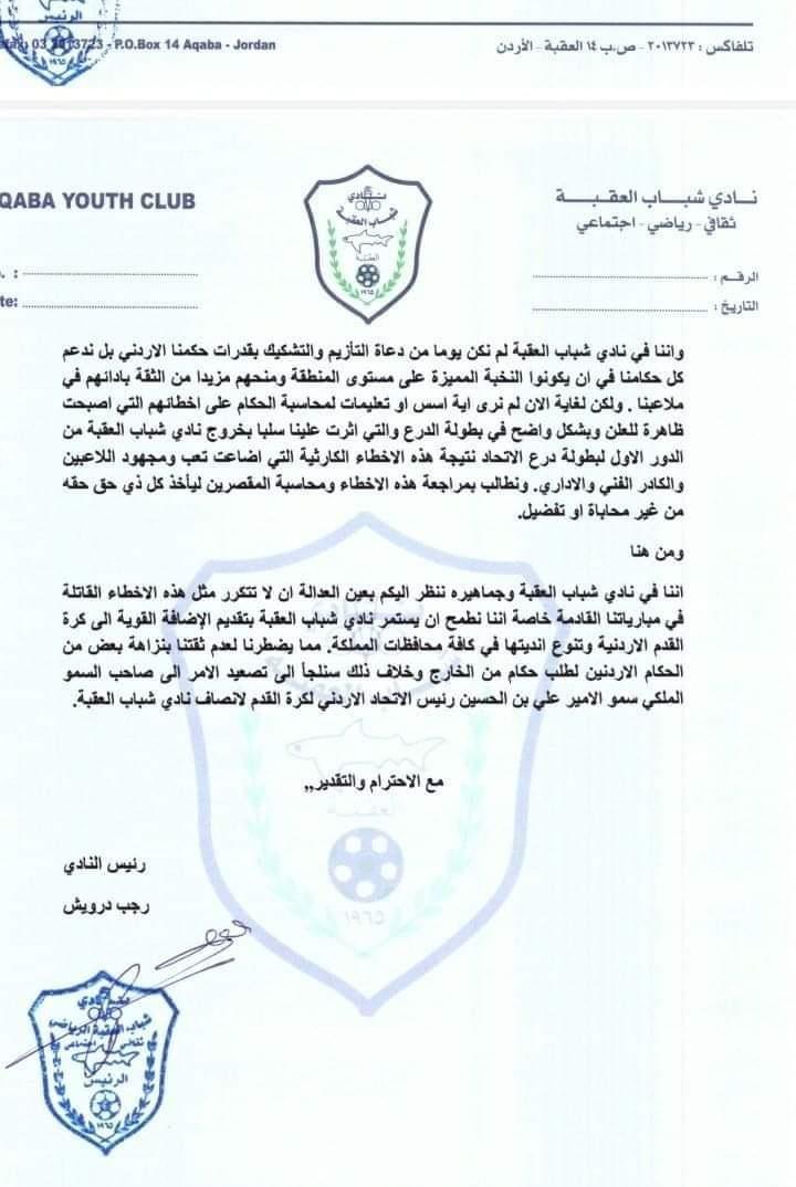 وجاء في الكتاب أدناه "لم نر أية أسس أو تعليمات لمحاسبة الحكام على أخطائهم التي أصبحت ظاهرة للعلن وبشكل واضح في بطولة درع الاتحاد والتي أثرت علينا سلبا بخروج نادي شباب العقبة من الدور الأول".