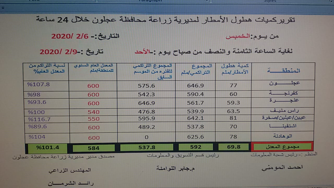وحسب يومية "الغد" تراوحت الكميات الهاطلة خلال اليومين الماضيين في مناطق المحافظة ما بين 60- 80 ملم، وفق احصائية مديرية زراعة المحافظة،التي أشارت إلى أن مناطق عبين وعجلون والوهادنة ورأس منيف تجاوزت معدلاتها السنوية، إذ وصلت بمناطق الجنيد التي تضم عبين وعبلين وصخرة 116 % من معدلاتها السنوية البالغة 550ملم.