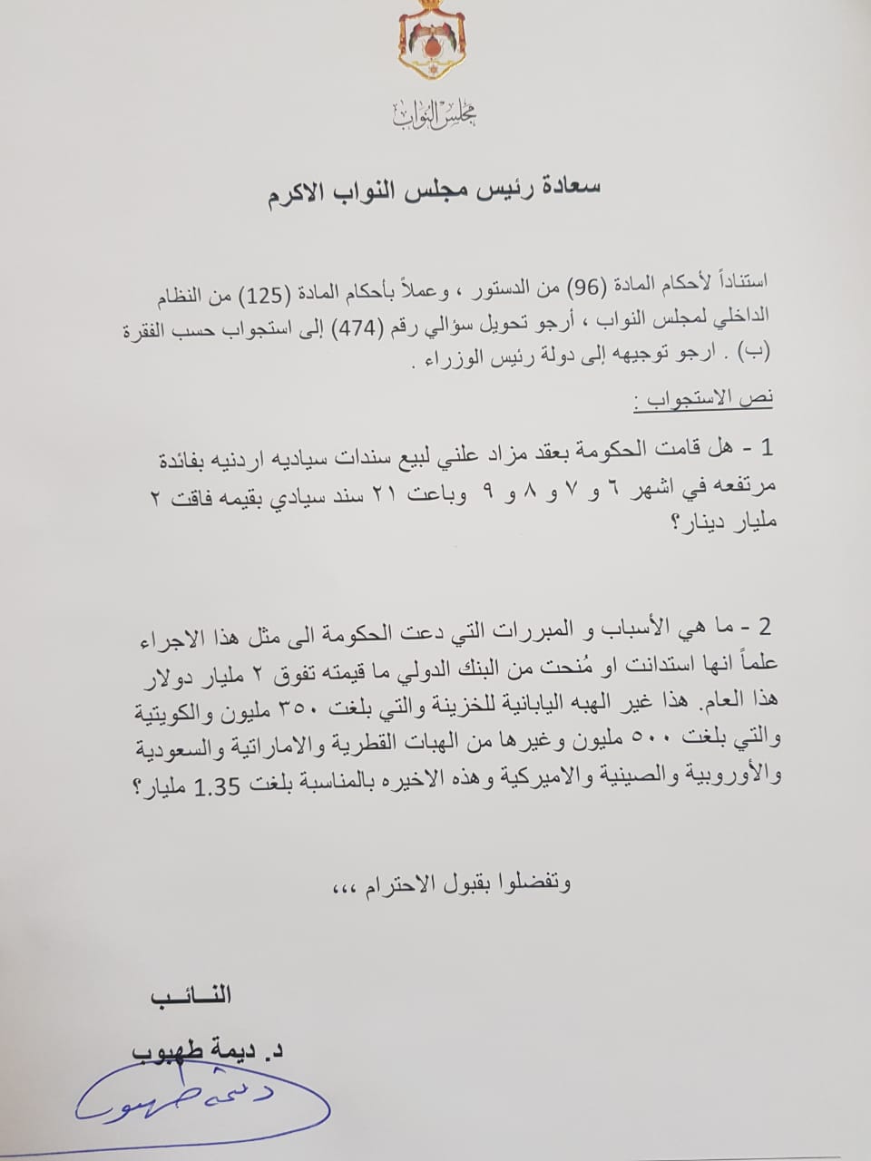 أحداث اليوم - حولت النائب ديمة طهبوب سؤالاً نيابياً لها الى استجوب موجه لرئيس الوزراء عمر الرزاز، حول حقيقة قيام الحكومة بعقد مزاد علني لبيع سندات سياديه اردنيه بفائدة مرتفعه في اشهر 6 و 7 و 8 و 9 وباعت 21 سندا سيادياً بقيمه فاقت 2 مليار دينار