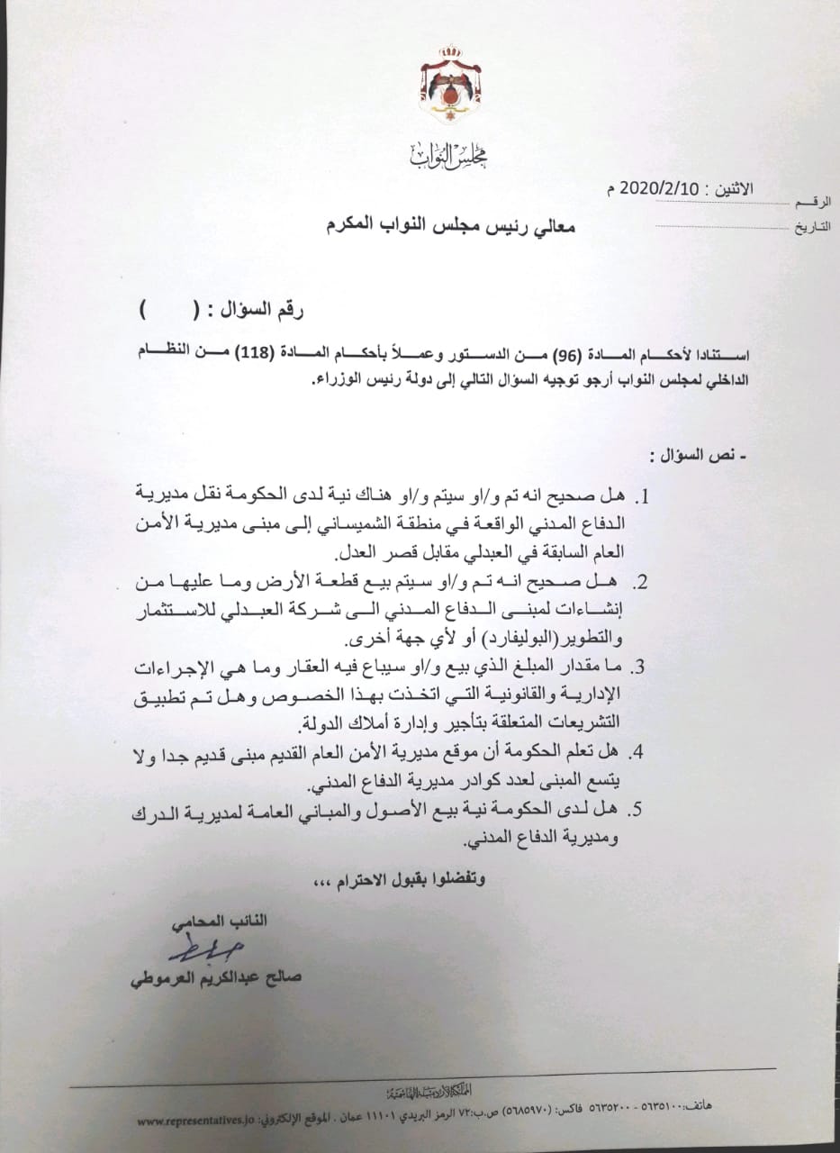 وسأل العرموطي معرفة إذا ما سيتم بيع قطع الأرض وما عليها من انشاءات لمبنى الدفاع المدني إلى شركة العبدلي للإستثمار والتطوير العقاري " بوليفارد" .