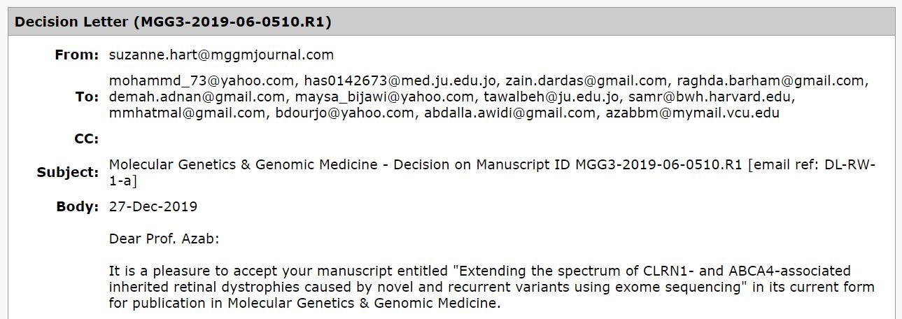 الحمد لله، تم قبول بحثنا في أمراض العيون للنشر في مجلة مختصة في علم الجينات الطبي ذات معامل تأثير عال نسبيا (2.45). My...