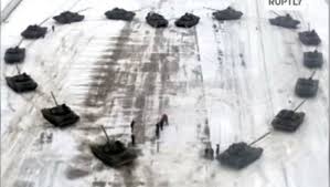 ففي مشاهد بثتها وزارة الدفاع الروسية تظهر 16 دبابة من طراز "تي-72بي 3" وهي تشكل قلبا وسط الثلوج في قاعدة ألابينو العسكرية قرب موكسو.