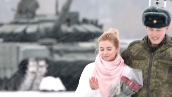 ويظهر الضابط دنيس كاسزانتزيف وهو يمسك يد حبيبته ألكسندرا كوبيتوفا وقد عصب عينيها ويقتادها إلى وسط القلب الذي تشكله الدبابات على ما جاء في مشاهد بثها تلفزيون الجيش الروسي "زفيزدا".