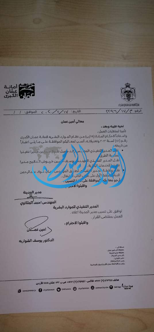 ووفق الكتاب الذي حصلت عليه "أحداث اليوم" تقرر نقل المدير التنفيذي رائد حدادين إلى مديرية الطرق،و والمدير التنفيذي يوسف الدلابيح لمديرية الخدمات الإدارية، في حين تم نقل المديري التنفيذي للطرق إيهاب الدباس ليكون مفتش أول على مرتب نائب الأشغال.