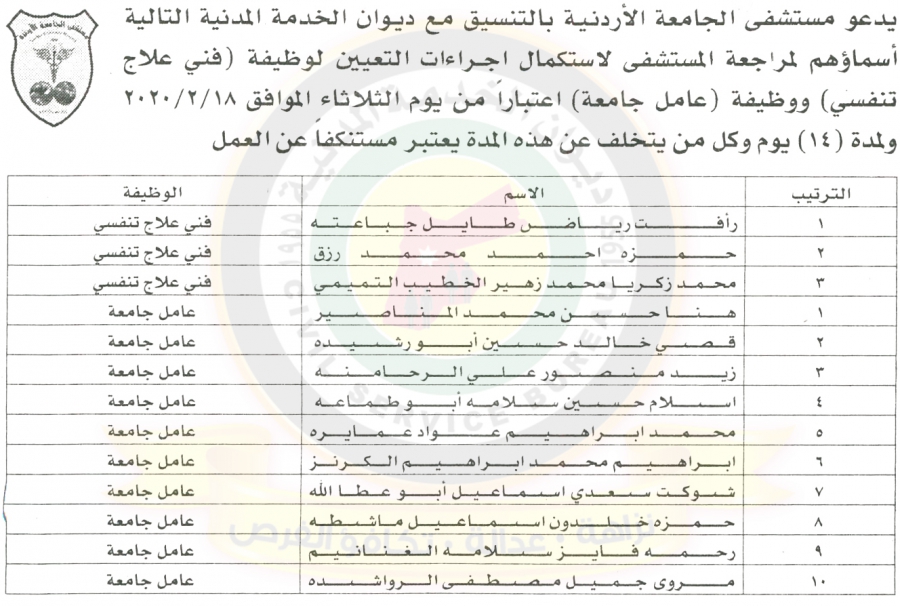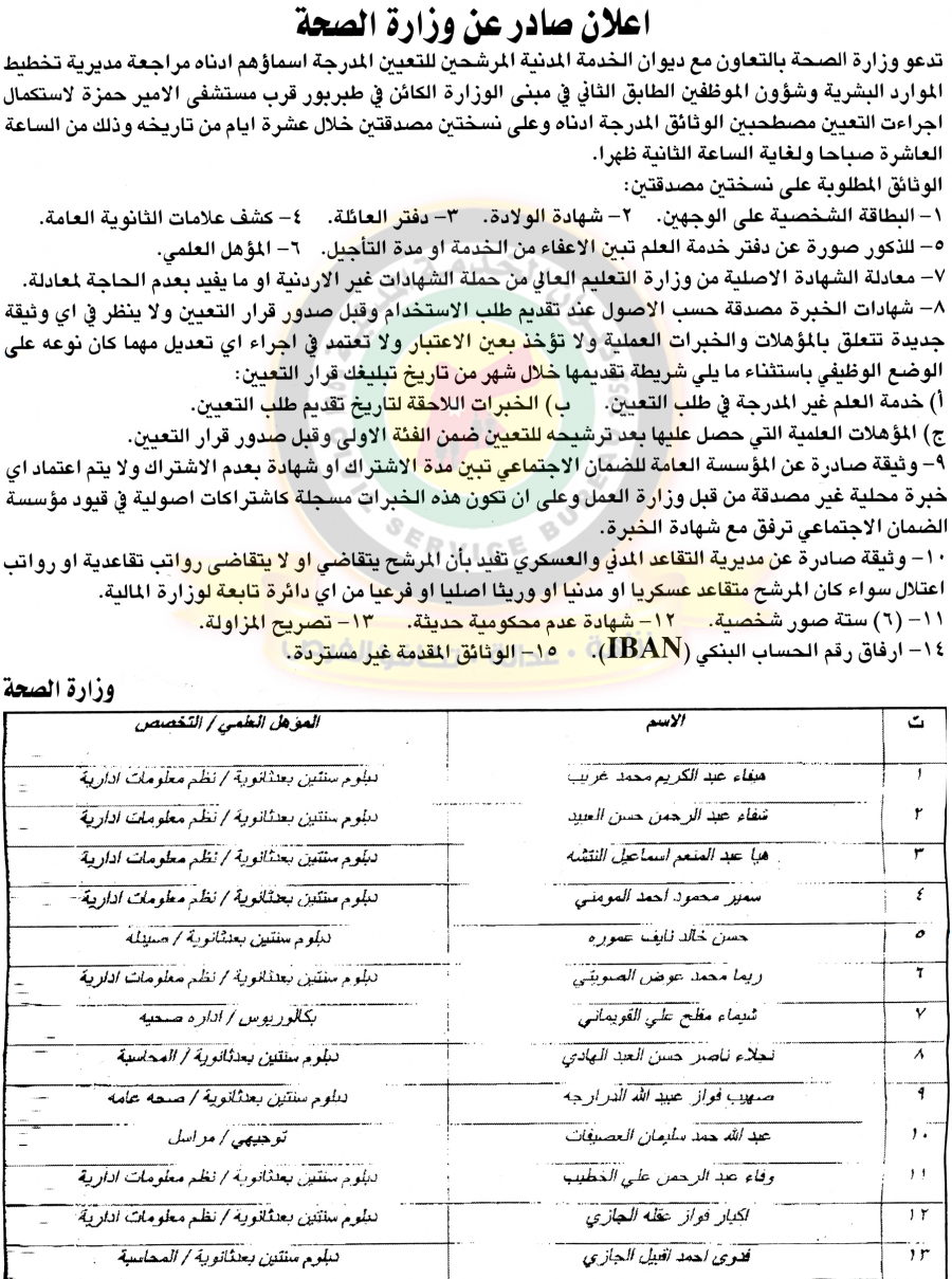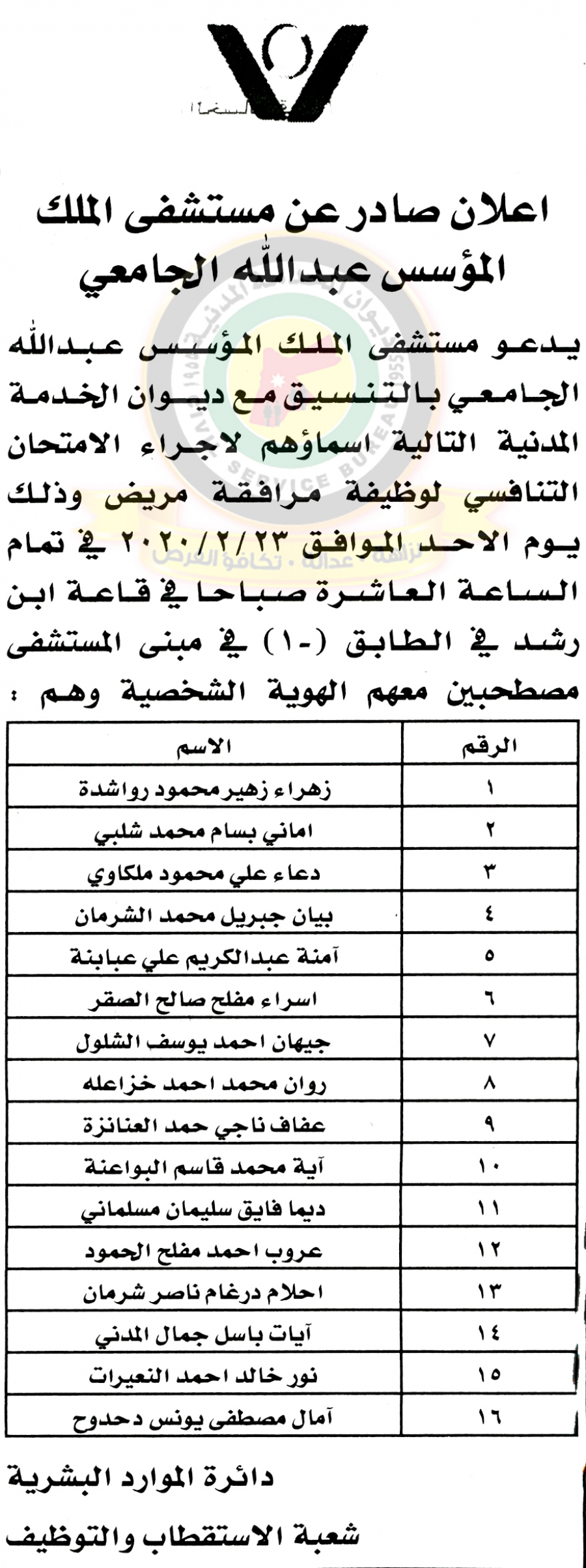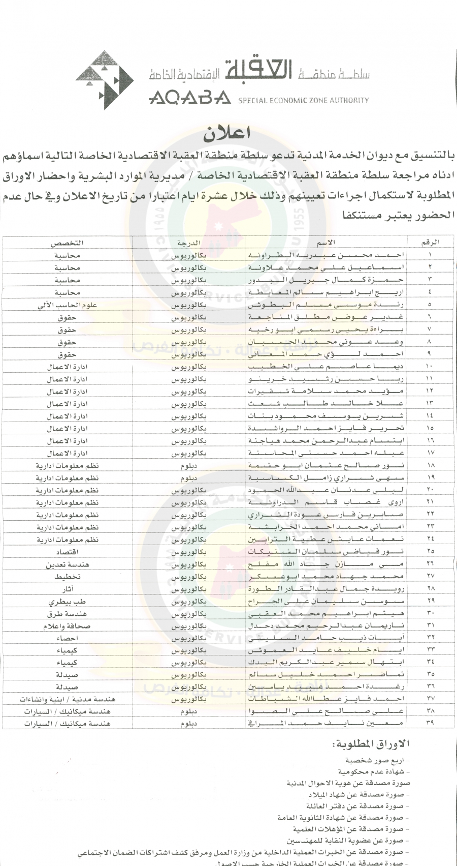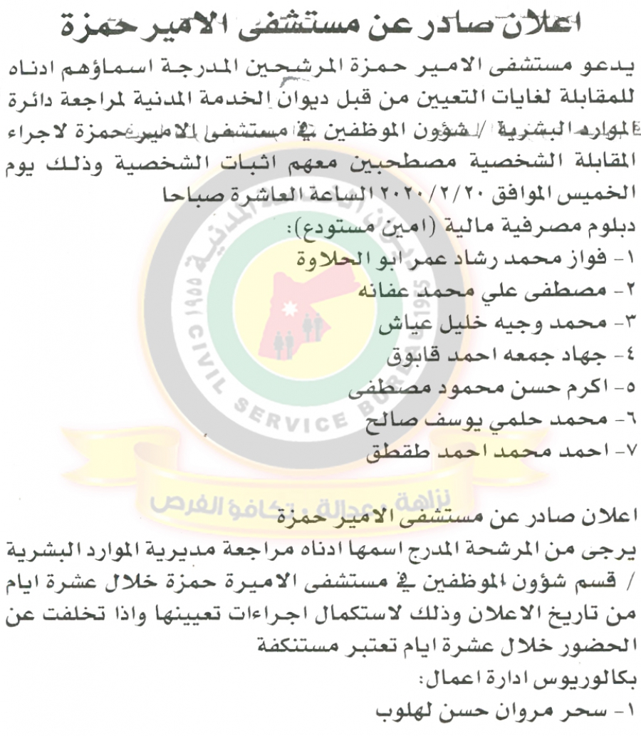 أحداث اليوم - دعا ديوان الخدمة المدنية بالتعاون مع مختلف الوزارات والمؤسسات الحكومية، التالية اسماؤهم لاجراء المقابلات الشخصية وعقد الامتحان التنافسي لغايات التعيين.